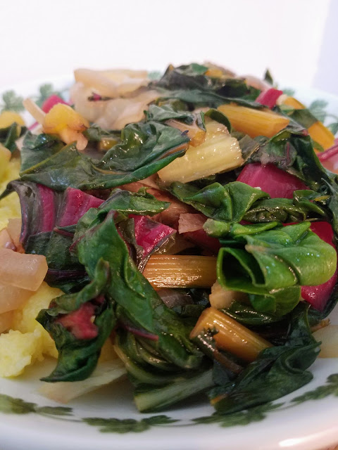I wanted the chard to really shine, so I just sauteed it with sliced onions and garlic and a splash of balsamic vinegar. Chard is pretty hearty and although the leaves wilt a bit, the stems and the leaves keep their weight and texture in a more substantial way than cooked spinach or other leafy greens. I served it over simple Italian polenta but it would be good with almost any grain or by itself.