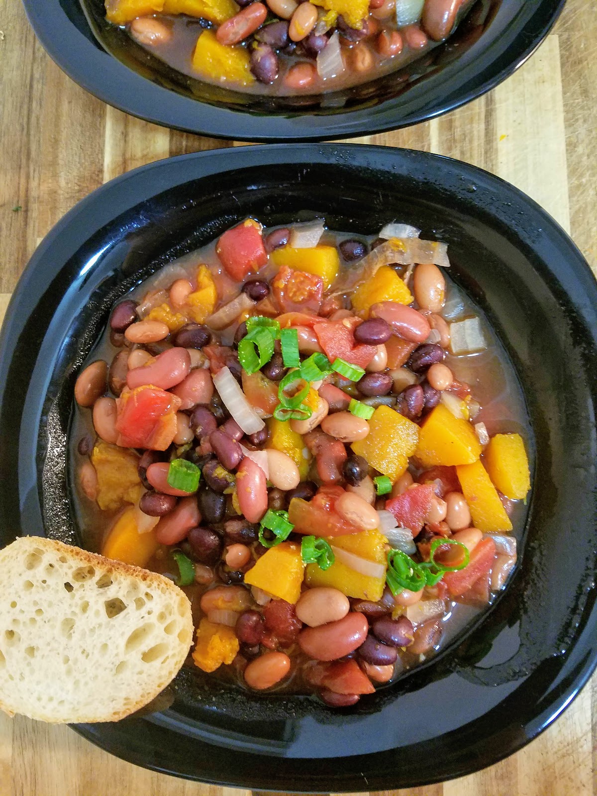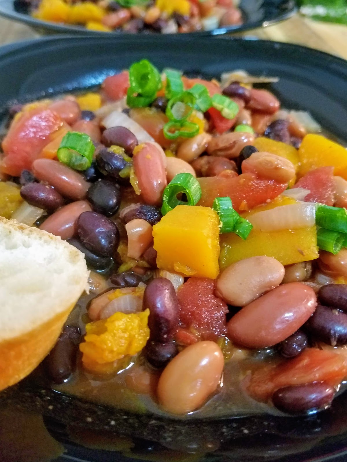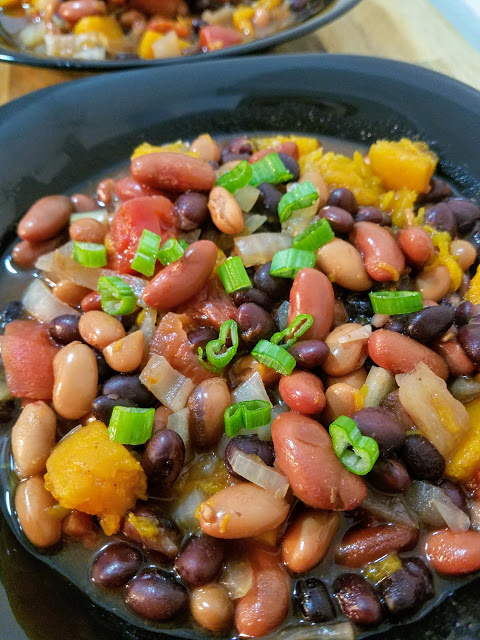 This easy peesy three-bean chili comes with a surprise: chunks of soft and buttery butternut squash! So besides being high in protein and fiber, spicy and warm and delicious, it also has a winter vegetable snuck in there for something special and vitamin-rich.