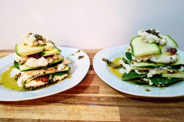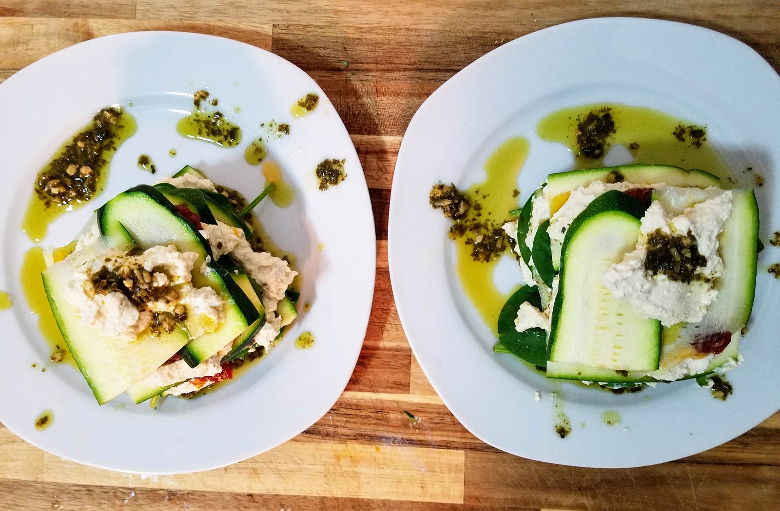 Add tofu, garlic, nutritional yeast, olive oil, and Italian seasoning to a food processor and blend until smooth. Assemble the lasagna in layers: two slices of zucchini, 1/2 Tbsp pesto, 1 dollop tofu ricotta (smoothed evenly across the pesto), 2-3 sun dried tomato pieces, 2-3 spinach leaves, and repeat for three layers. Alternate the direction of the zucchini slices each layer to create a sturdier lasagna.