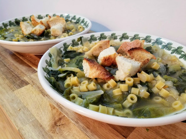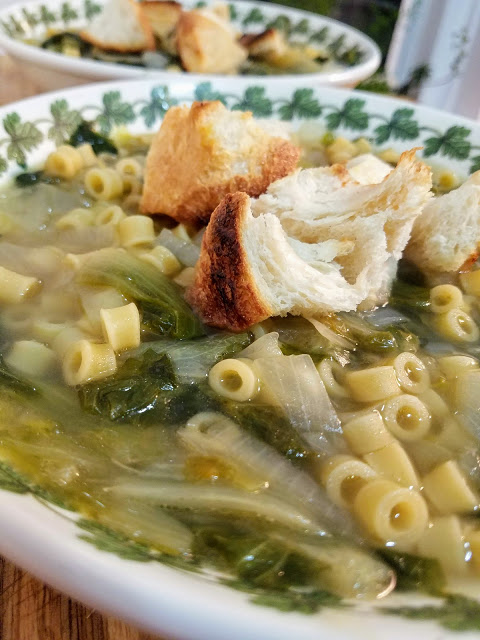 Slice rinsed escarole leaves into 1 inch strips. Let drain in a colander and set aside. In a large sauce pan or soup pot, melt butter over medium heat and add onions and garlic. Cook for about five minutes, stirring occasionally, until onions are golden brown. Add escarole and 1 cup broth, cover, and cook on low for about 15-20 minutes or until the escarole is wilted fully and a darker green color (this could take longer depending on the freshness of the escarole). Add the remaining broth and the pasta and bring to a simmer. Let simmer for about 10 minutes or until pasta noodles are al dente. Remove from heat, season with salt and pepper to taste, and serve with croutons.