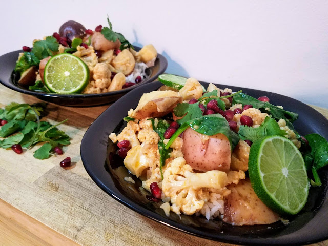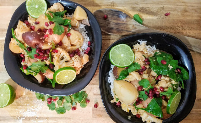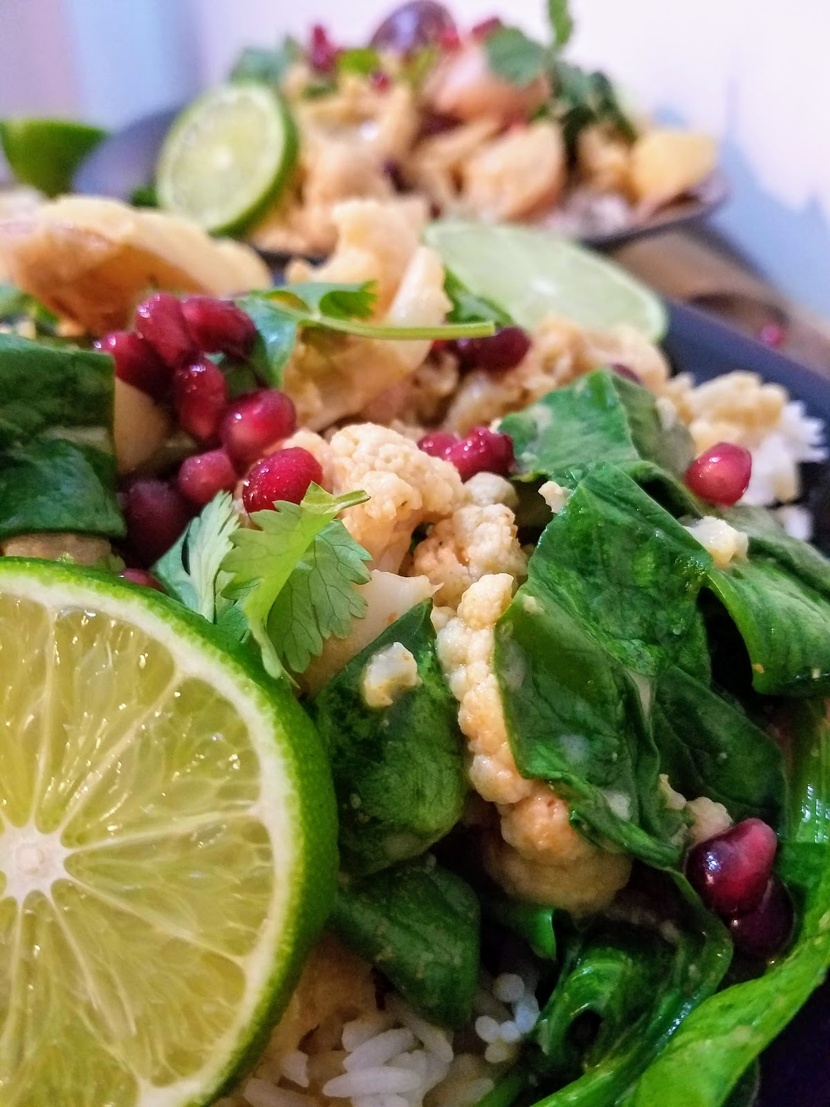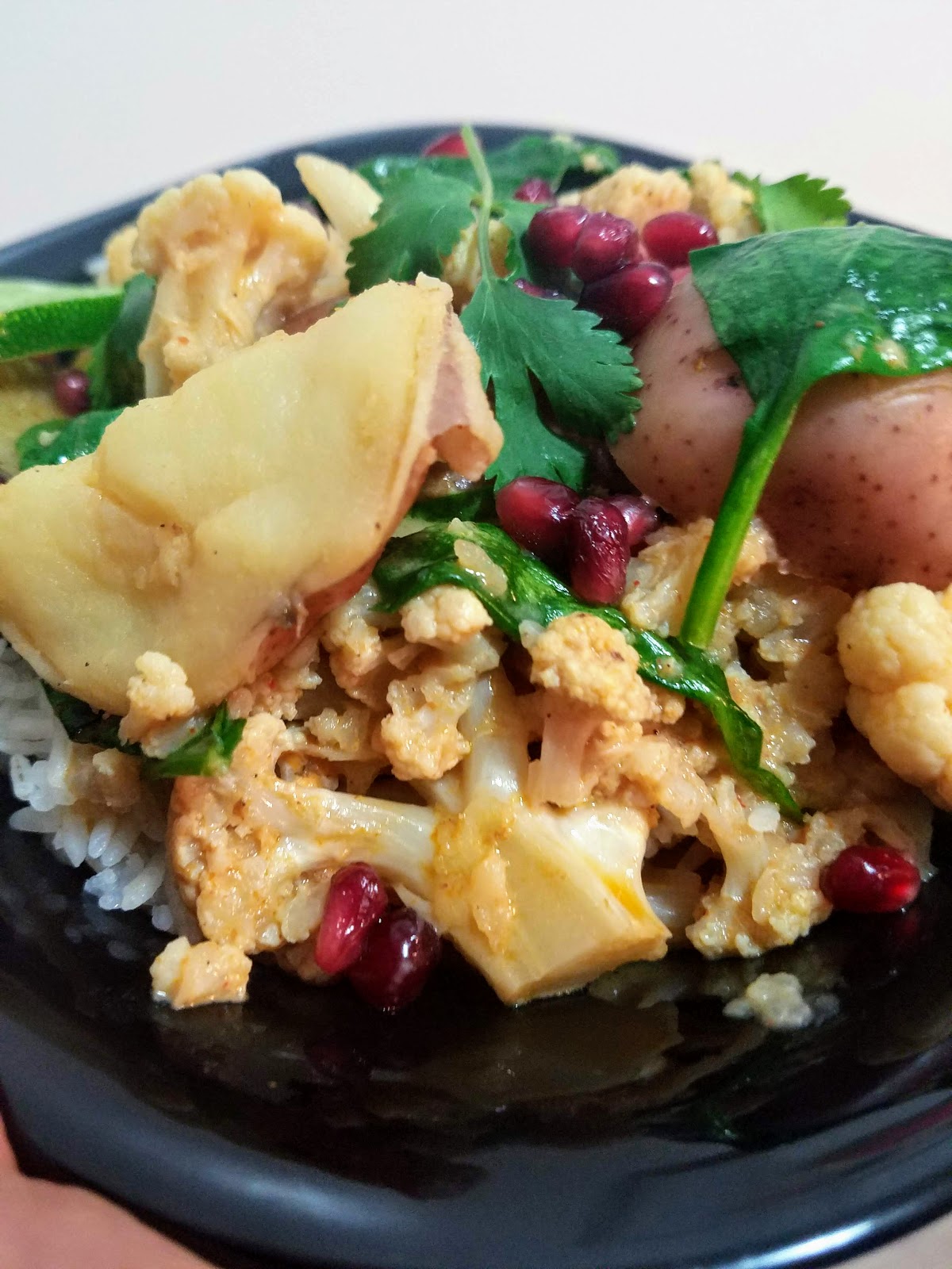 Add curry paste, coconut milk, veggie broth, and soy sauce to the slow cooker and mix together. Add the potatoes, cauliflower, cinnamon, cumin, and salt and pepper. Stir to coat, cover, and cook on low for 6 hours. In the last five minutes, stir the spinach into the curry and cover until wilted. Garnish with a handful of pomegranate arils, cilantro, and lime wedges. Serve over rice and with fresh naan if desired. Enjoy!