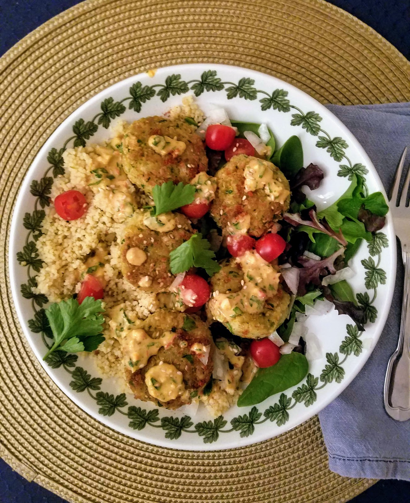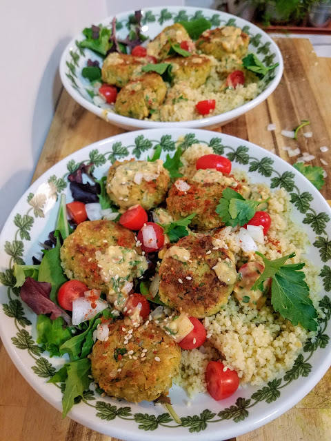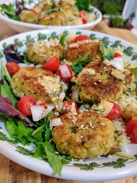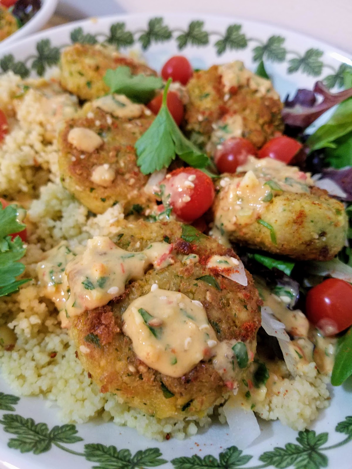 This recipe is very simple and easy – you use a food processor to mix the dough, then form it into little balls or disks, and then fry them lightly in oil on the stove. I decided to make a little sauce to go with them and serve it over couscous + mixed greens, but you certainly could garnish with whatever you’d like. Falafel pitas or wraps are always favorites of mine as well. Once you know how to make the disks, the sky’s the limit!