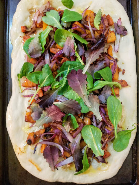 Roasted butternut squash. Sweet caramelized red onion. Balsamic vinegar glaze. Fresh greens….all on a PIZZA!?