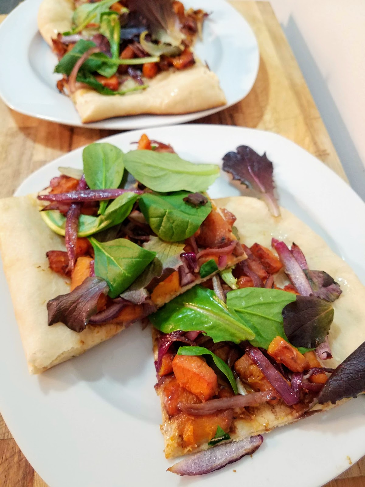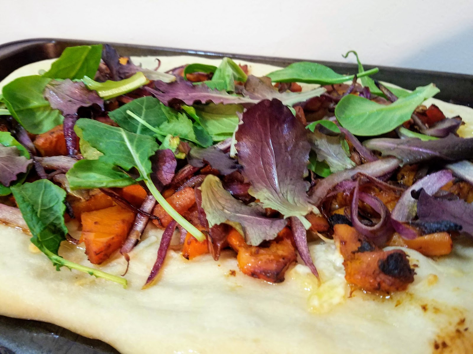 Roasted butternut squash. Sweet caramelized red onion. Balsamic vinegar glaze. Fresh greens….all on a PIZZA!?