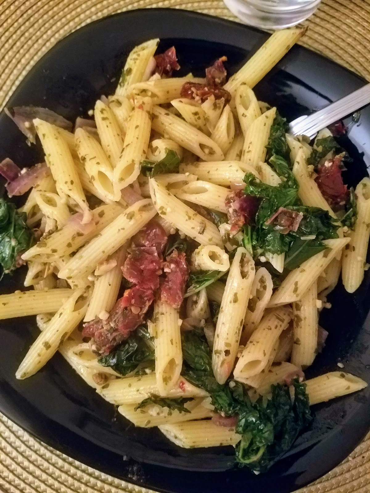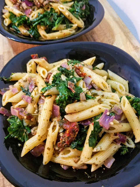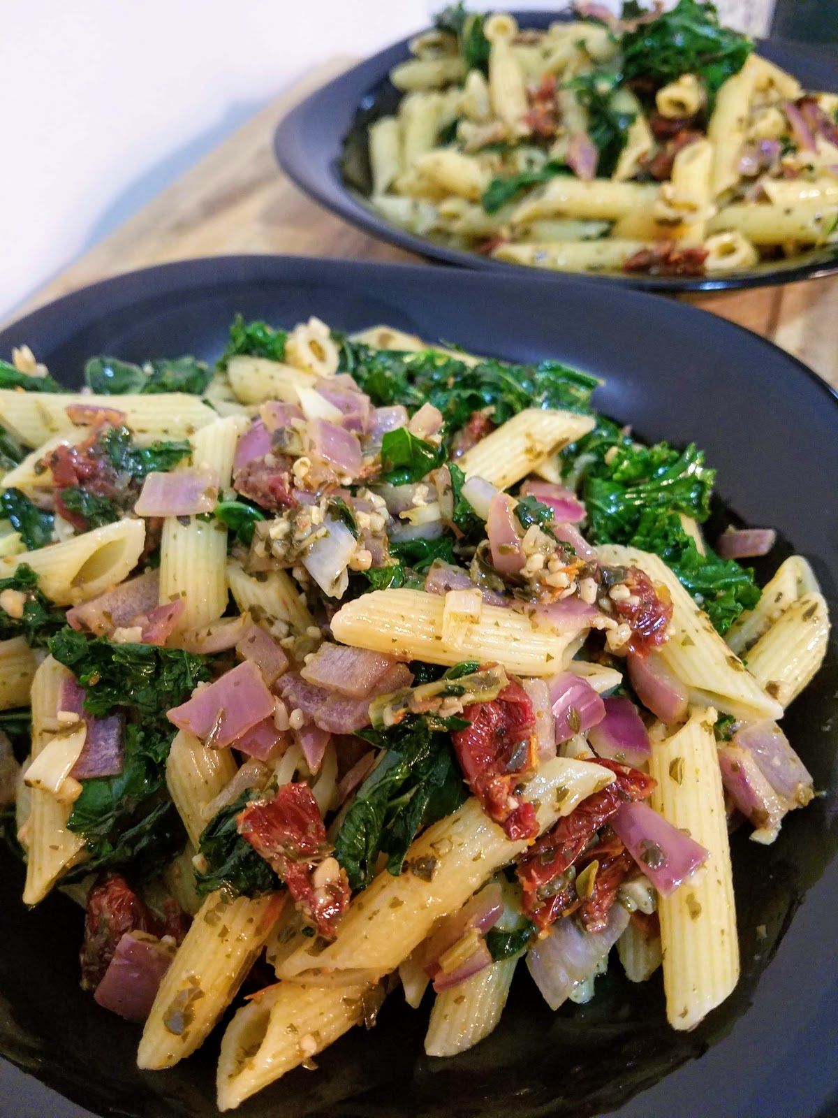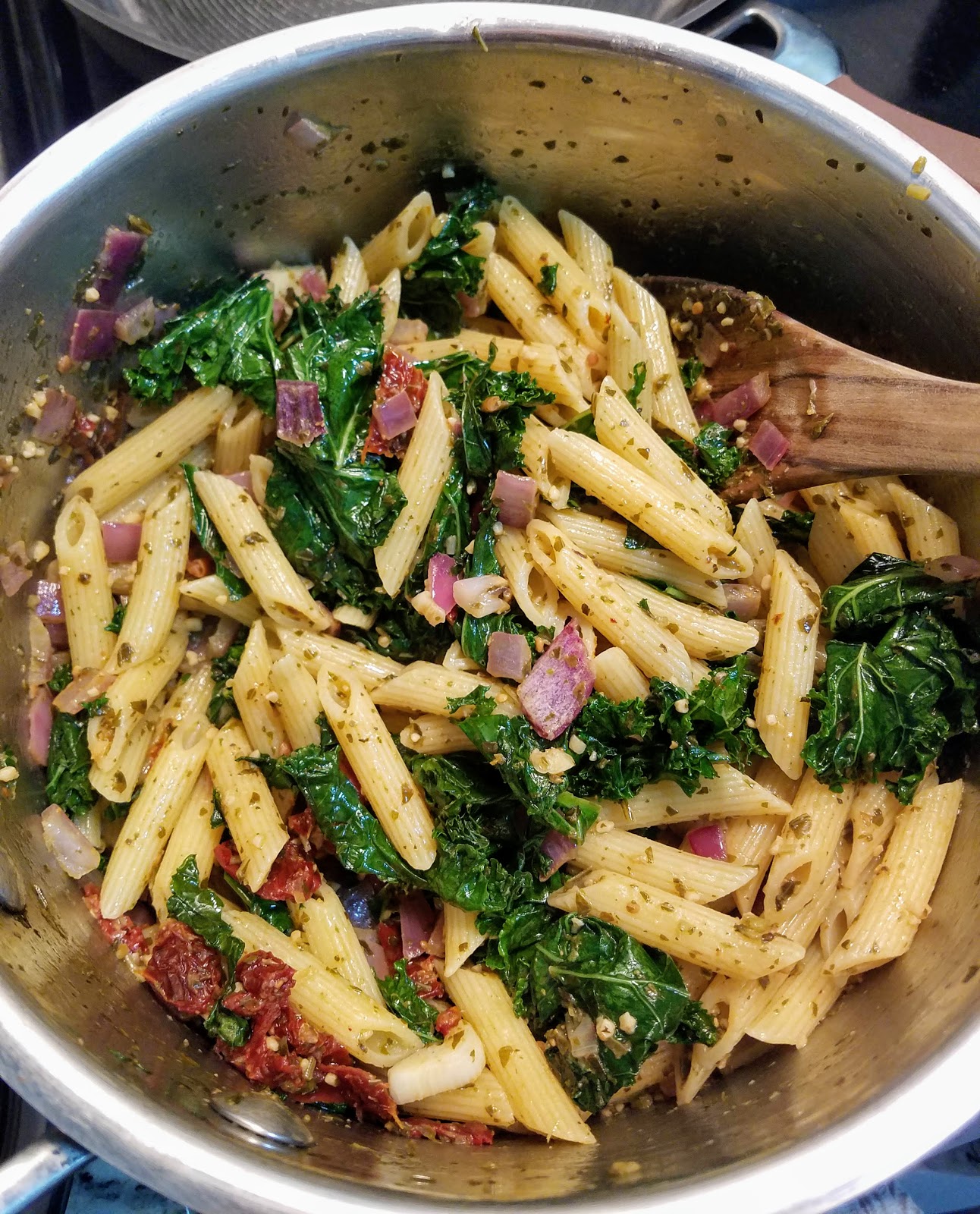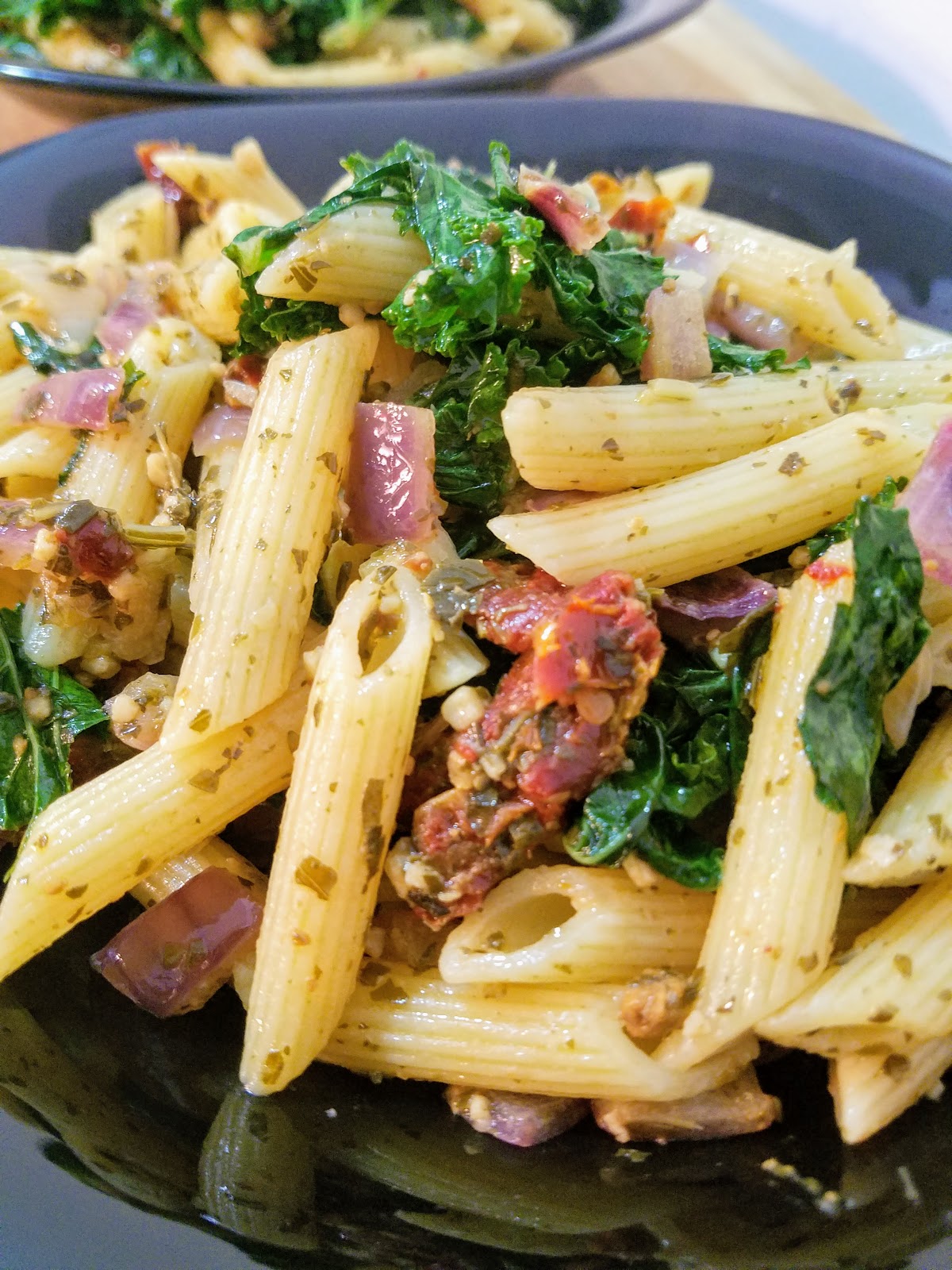 Bring a large pot of salted water to a boil. Once boiling, add penne and cook as instructed on the box, about 10 minutes. Drain and set aside. Meanwhile, in a large, deep skillet, heat 2 Tbsp olive oil over medium heat. Add garlic and red onion and saute 3-4 minutes or until softened and slightly browned. Add sun-dried tomatoes and kale and saute another 3-4 minutes or until kale is wilted. Lower heat to low and season with salt and pepper. Add drained pasta and vegan pesto, and mix until fully incorporated and the pesto evenly coats the pasta and vegetables (adding more pesto if necessary). Serve immediately.
