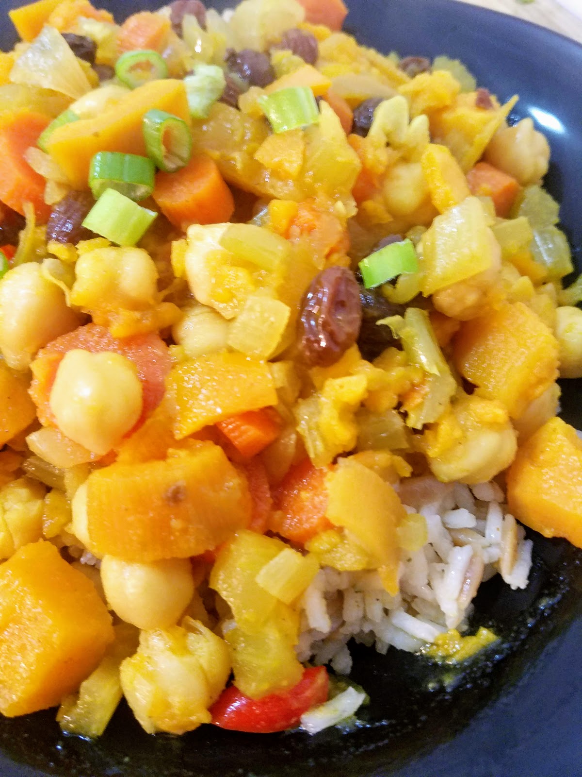 Heat 1 Tbsp olive oil in a large, deep pot over medium high heat. Add the onion, pepper, and garlic and saute until softened, about 5 minutes. Add the carrots, sweet potatoes, celery and raisins, and stir in the vegetable broth, lemon juice, maple syrup. Season with cumin, turmeric, ginger, and cinnamon. Bring the pot to a boil, cover, and reduce heat to simmer until the vegetables are tender, about 30 minutes. Add the chickpeas and season with salt and pepper. Stir to combine and cook the soup for an additional 10 minutes. Garnish with fresh herbs and serve with rice, if desired.