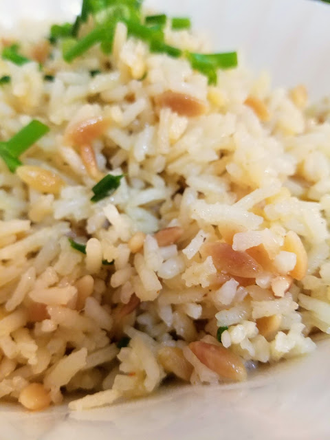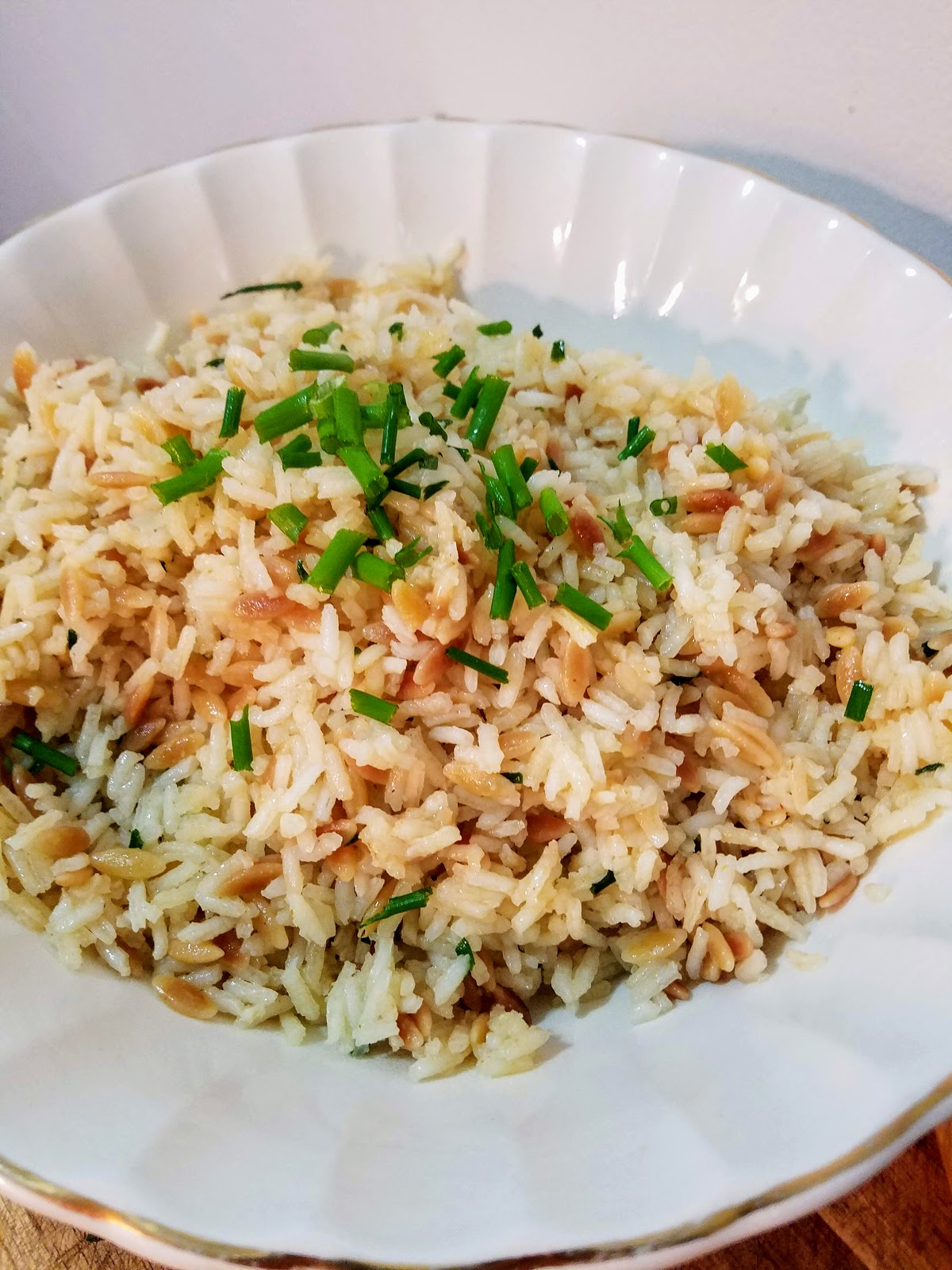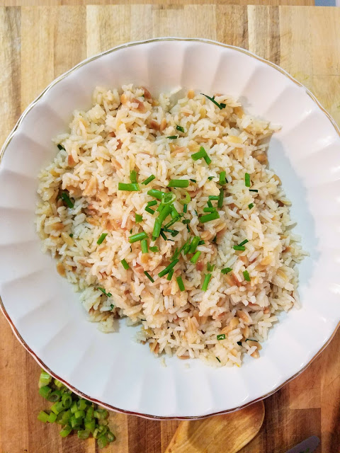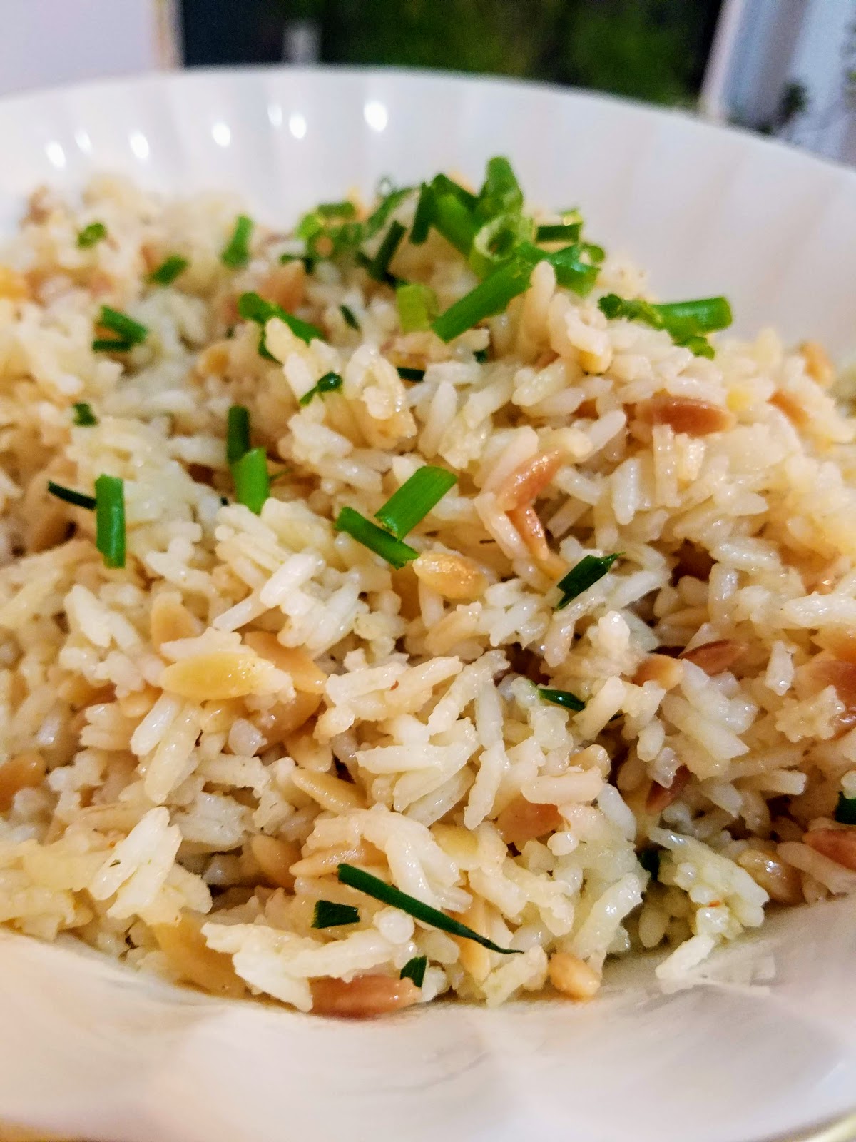 We have rice with our dinner pretty often, whether it is with curry, stir fry, or just lots of yummy roasted vegetables. I love my rice cooker and am always happy with the fluffy, starchy white rice it makes. However, sometimes I want to up our rice game with a more special base of flavors and textures. Tonight we tried rice pilaf, and I paired it with the Vegetable Tagine dish I wrote about a few days ago.