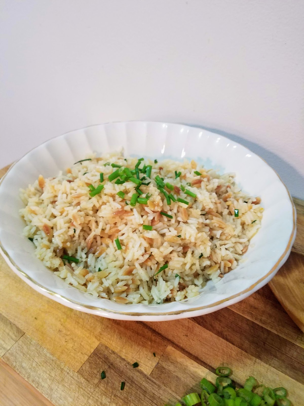 In a small saucepan over medium heat, add the vegetable broth, butter, salt, garlic powder, pepper, paprika, and onion powder, bring to a simmer, and reduce to low heat. In a deep skillet or large saucepan over medium-low heat, add the olive oil and the orzo. Cook until brown, or about 4 minutes. Add the rice and cook until it turns bright white, about 5 minutes. Pour the broth mixture into the skillet and stir to combine. Bring to a simmer, cover and cook for 12-15 minutes. Add the fresh chives or parsley, cover, turn off heat, and let sit for 5 minutes or until all of the broth is absorbed. Serve immediately.
