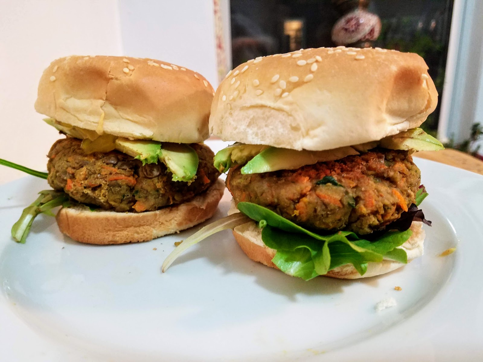 In a small saucepan, add lentils and 2 cups water. Bring to a boil and reduce heat to simmer uncovered until all the water is absorbed, about 15-18 minutes. Let cool slightly while you mince the garlic and grate the carrots. Add all the ingredients to a food processor and pulse until it is mixed well (there still should be a little texture, not completely smooth). If it’s too dry and won’t mix, add a little bit more olive oil. If it’s too wet, add more breadcrumbs. Form the mixture into patties. Heat 2 Tbsp olive oil in a large skillet over medium high heat. Once the pan is hot, add patties to the pan and cook for 3 minutes or until browned, then flip and cook for 3 more minutes on the second side or until browned. Serve on buns with toppings and condiments as you wish!