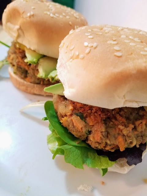 This burger is made with green lentils, tahini, grated carrots, and breadcrumbs; it’s really healthy for you! It takes about 30 minutes to make, and it has pretty good texture. I probably could’ve added more tahini and/or olive oil to mine (as you can probably see, they look a little dry), but I’ve amended that in the recipe below. Try them out and let me know what you think!