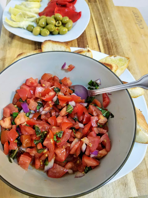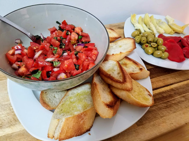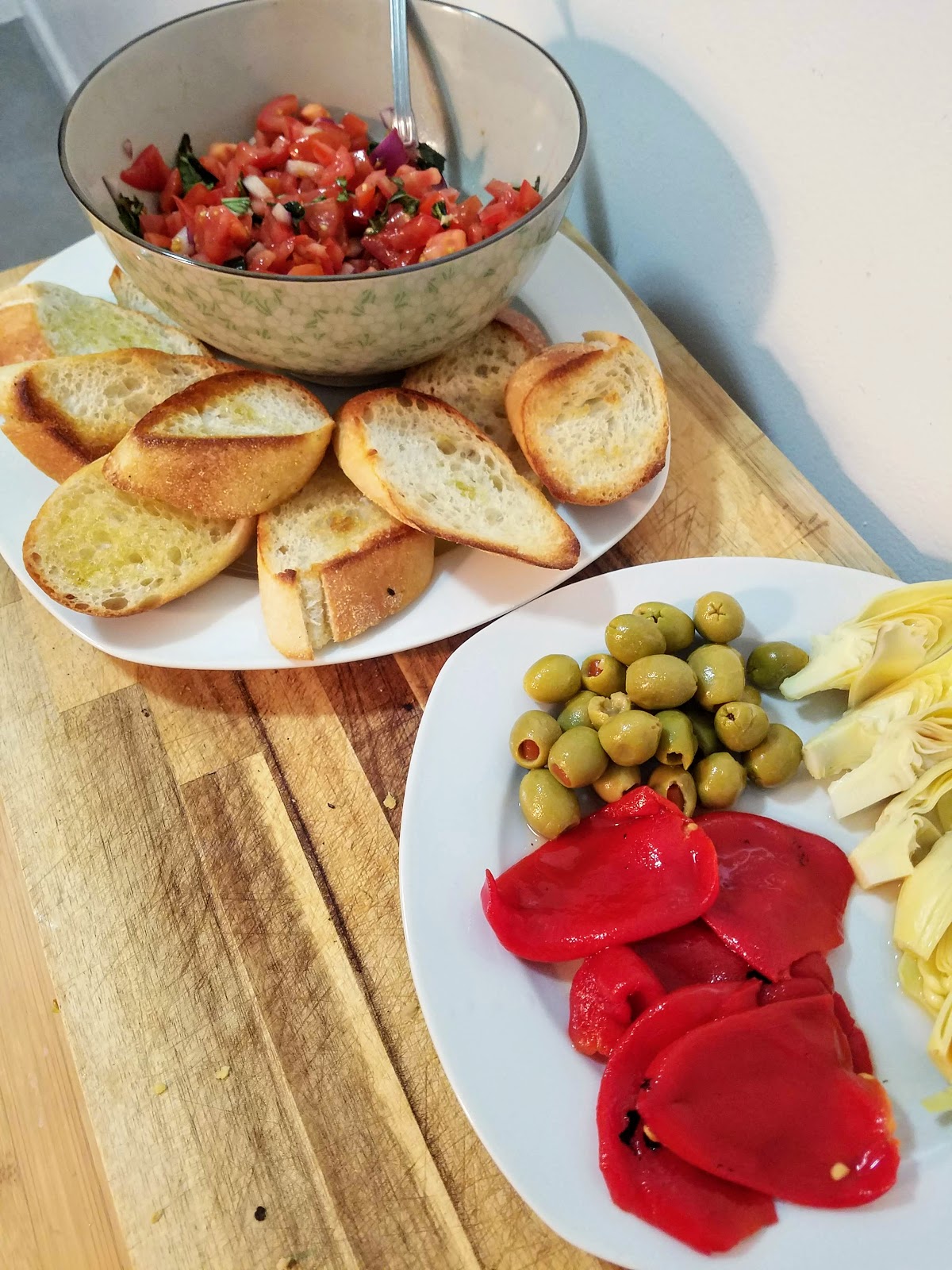 It’s great as a party appetizer, obviously, but I highly suggest eating this with a bunch of other finger foods for a fun and different take on dinner! We had our baguette toasts with bruschetta, roasted red peppers, artichoke hearts, and stuffed olives, for a fun finger food meal. Pick up a fresh baguette on your way home from work and you’ll have dinner on the table in 10 minutes. That’s what I’m talking about!