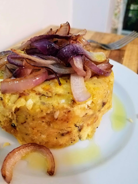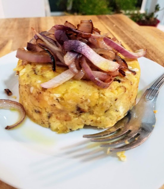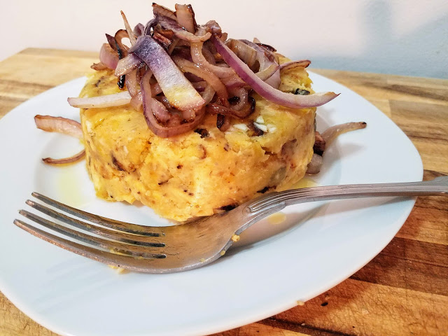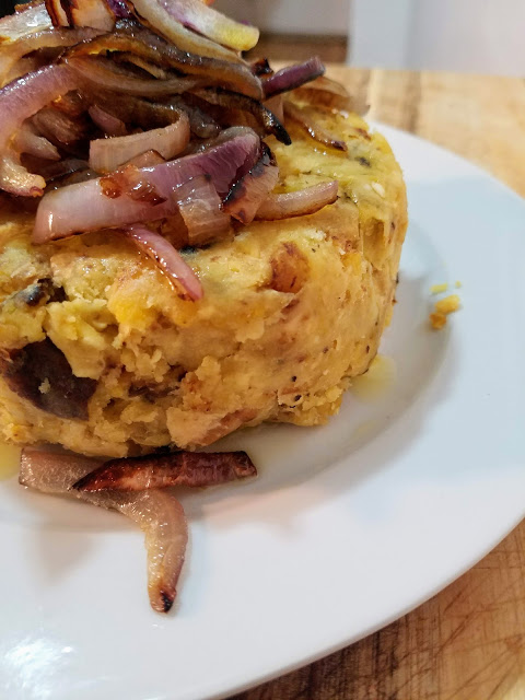 To peel plantains, top and tail the plantains, and then score the rind long-ways in several places. Under warm running water, run your fingers under the scores to loosen the rind. It should peel away easily after being loosened under the warm water. Cut the plantains into one inch pieces. Coat a skillet with vegetable oil and heat over medium high heat. When the oil is hot, add the plantain pieces and fry on each side for 3-4 minutes or until deep golden brown. Remove from oil and drain on paper towels. Meanwhile, in a medium skillet over medium low heat, add 1 Tbsp olive oil and red onion slices. Cook until brown and caramelized, stirring occasionally. In a mortar and pestle, or in a large mixing bowl, add fried plantains, garlic, fried onions, and salt, and add olive oil and vegetable stock a little bit at a time as you mash everything together; keep adding more liquids until the mofongo comes together and is a bit moist. If using a mortar and pestle, push firmly into the base to form a dome shape (otherwise, mold the form with your hands or with a small bowl). Flip over onto a plate and top with caramelized red onions and another drizzle of olive oil. Serve immediately.