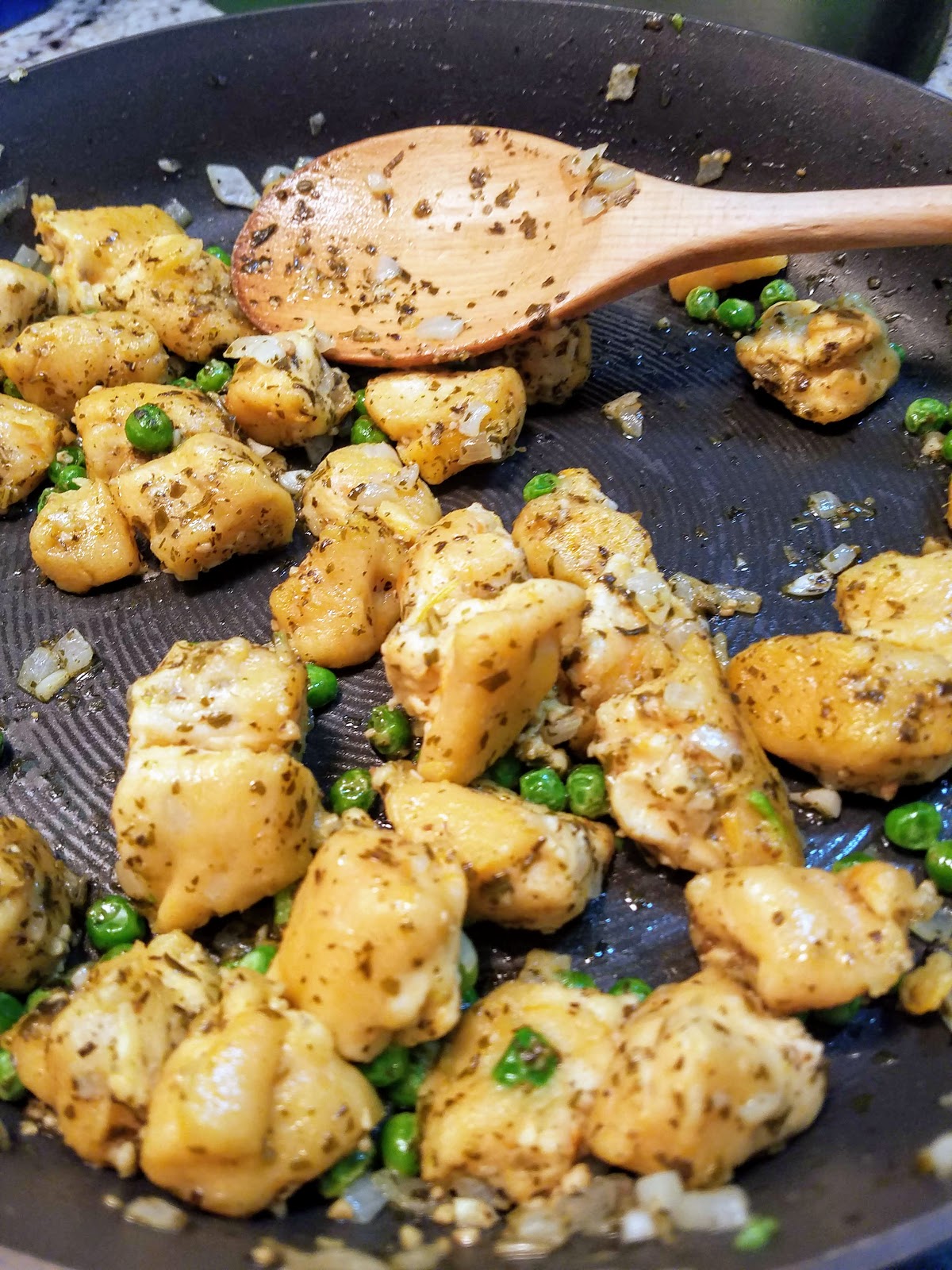 You could serve this with a marinara sauce, vodka sauce, or just drizzled with olive oil and freshly chopped herbs. We had ours sauteed with garlic, onion, and peas, and topped it with a dollop of vegan pesto and some vegan parmesan cheese. Feel free to adapt to your tastes!