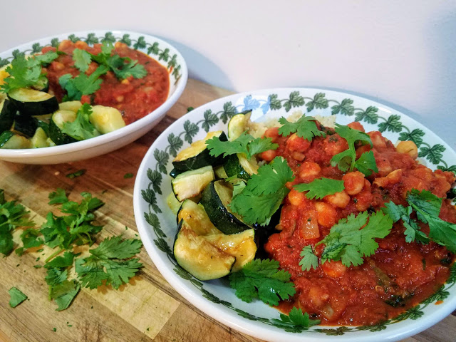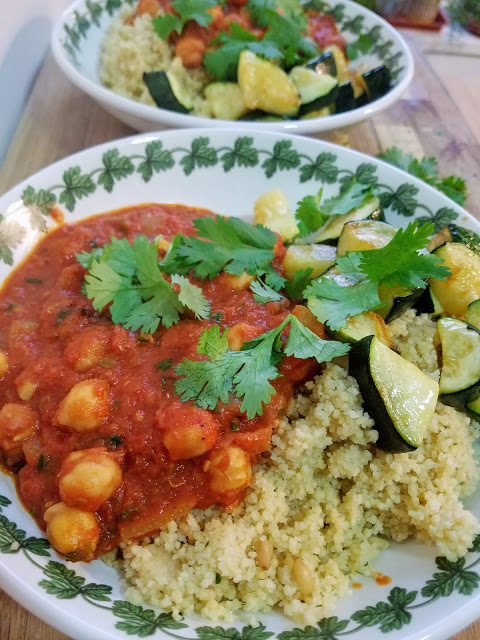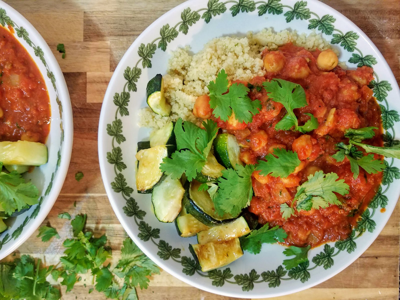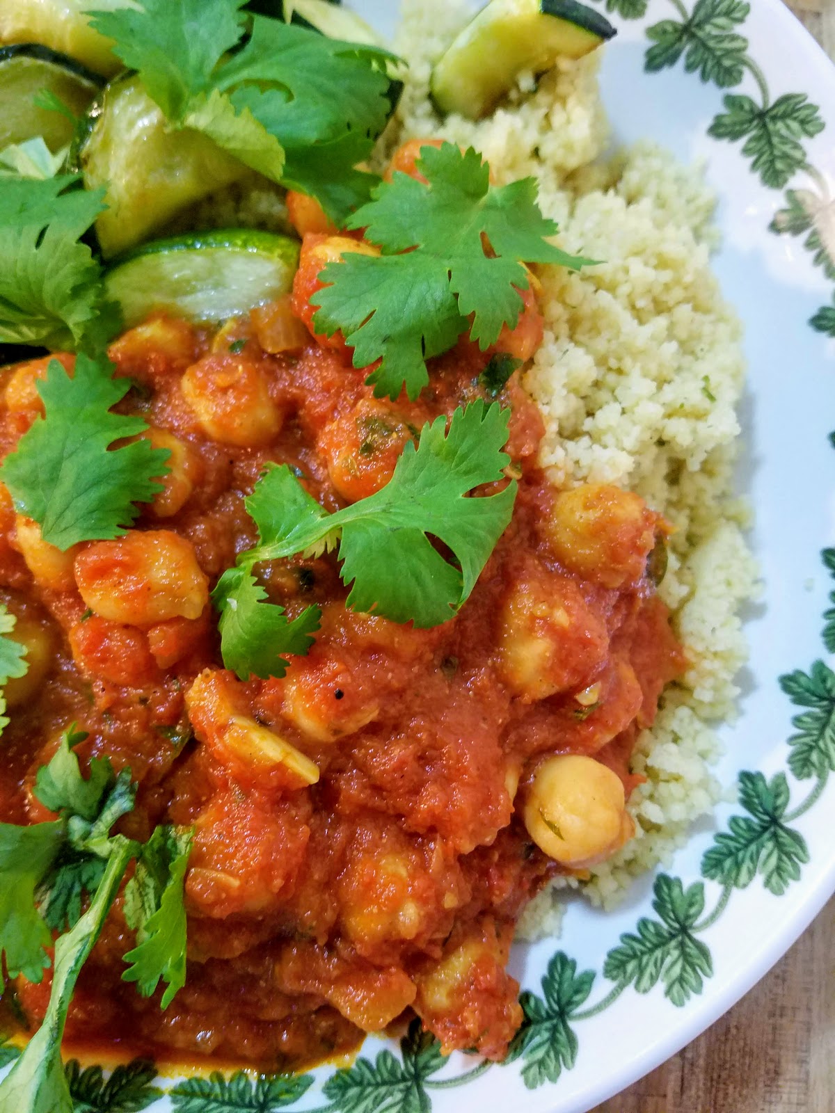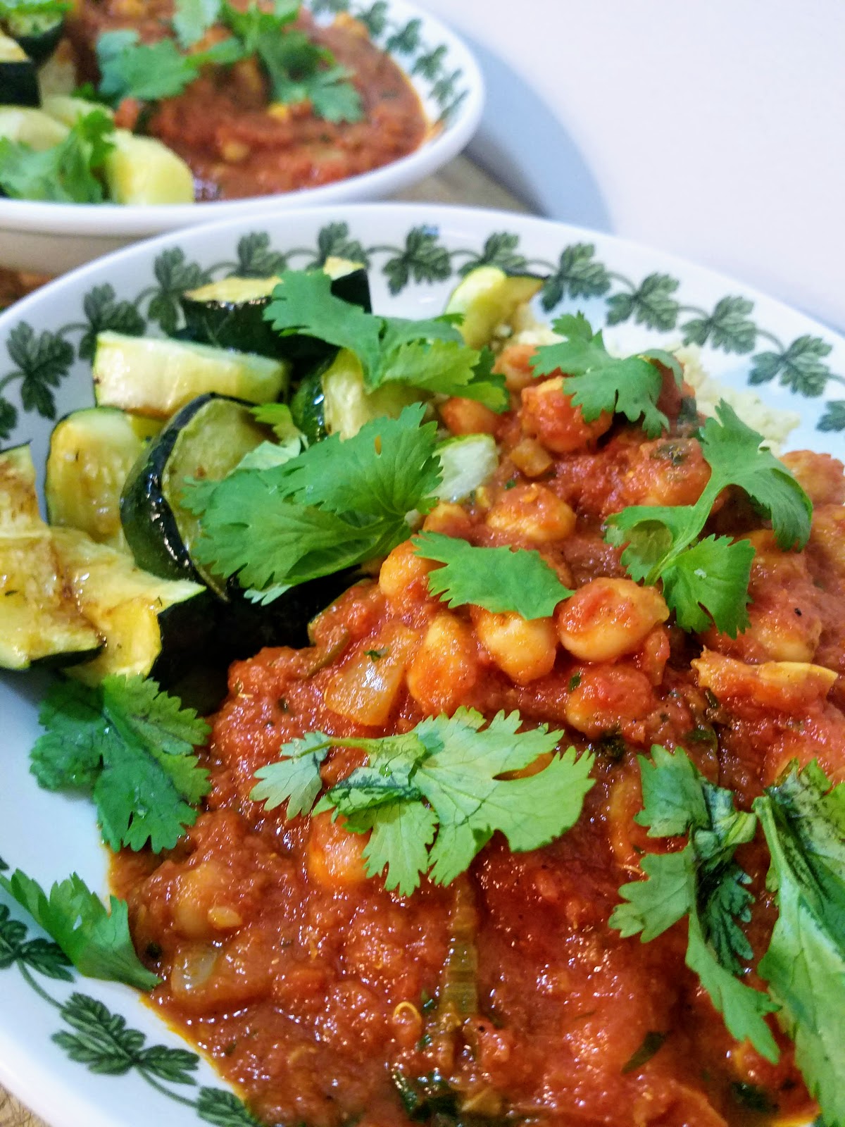 In a large and deep skillet, heat olive oil over medium heat and add onion and chile. Saute for 1-2 minutes or until slightly softened. Add cumin, coriander, chili powder, turmeric, garam masala, salt, ginger, and garlic. Saute for another 1-2 minutes or until the spices are aromatic. Add crushed tomatoes, chickpeas, sugar, and lemon juice and stir. Bring to a gentle simmer and let cook for at least 10 minutes. Add cilantro in the last 2 minutes of cooking and stir. Serve immediately over couscous or rice, topped with more cilantro. (We also ate ours with roasted zucchini.)