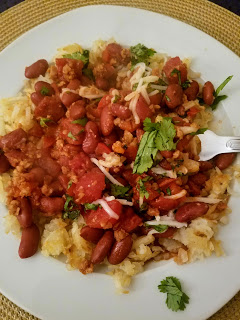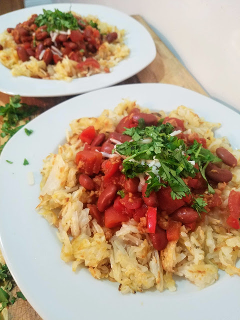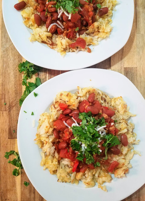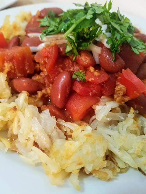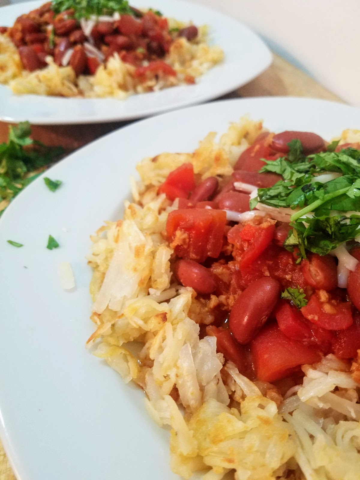 Heat a large skillet over medium high heat and add frozen hashbrowns in a thin layer. Drizzle with 1/2 Tbsp olive oil and a pinch of salt. Let cook for 5-7 minutes or until golden brown, and carefully flip to cook on the other side for another 5-7 minutes. meanwhile, in a large saucepan over medium high heat, add 1 Tbsp olive oil, garlic, and red pepper and let cook for 1-2 minutes. Add Gardein crumbles and cook for another 2-3 minutes, stirring frequently. Add kidney beans and diced tomatoes, along with chili powder, paprika, and red pepper flakes. Stir to incorporate, and let simmer for 8-10 minutes. Serve hashbrowns topped with chili, 1 Tbsp of Daiya shreds, and fresh chopped cilantro.