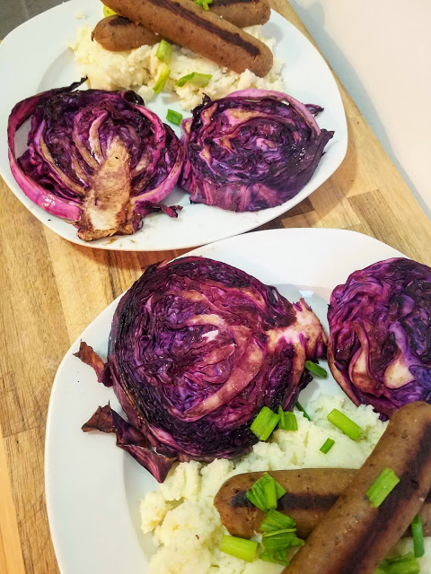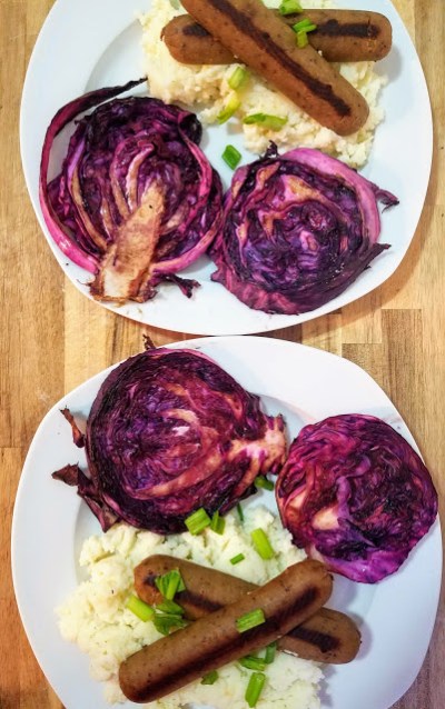 I whipped up a packet of instant mashed potatoes and grilled a few fancy veggie sausages to serve with them, but no doubt these cabbage steaks were the stars of the show.