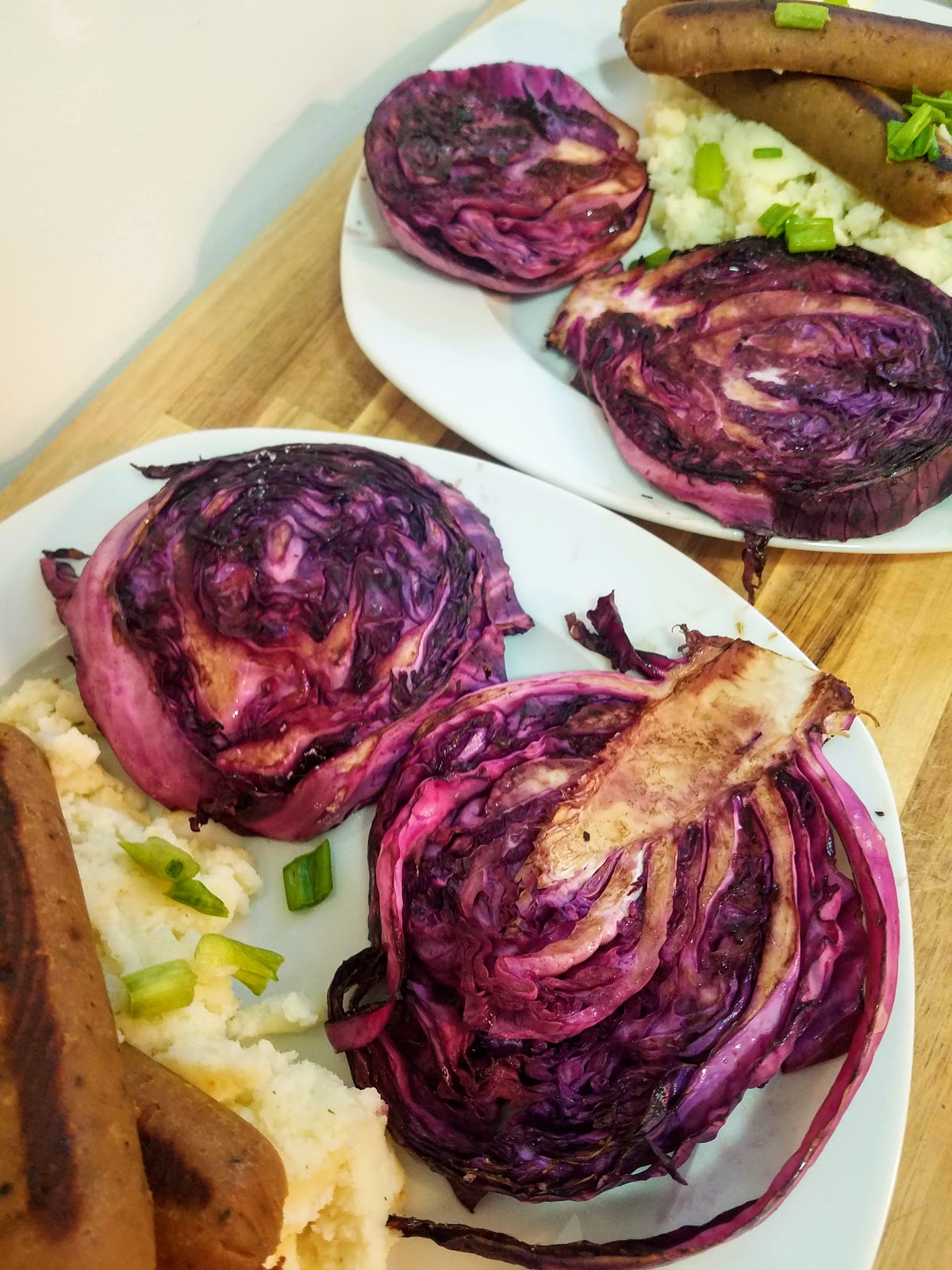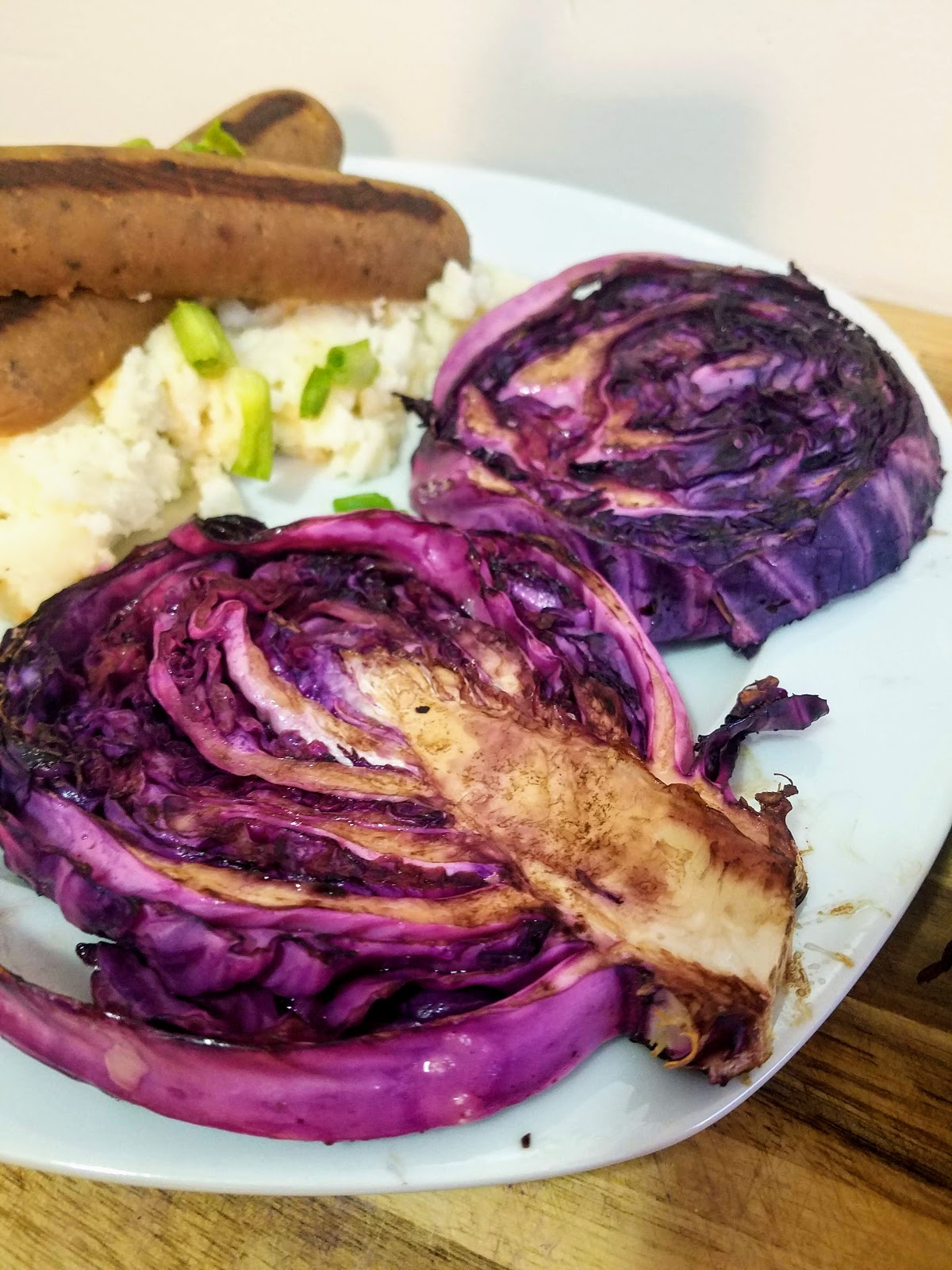 I whipped up a packet of instant mashed potatoes and grilled a few fancy veggie sausages to serve with them, but no doubt these cabbage steaks were the stars of the show.
