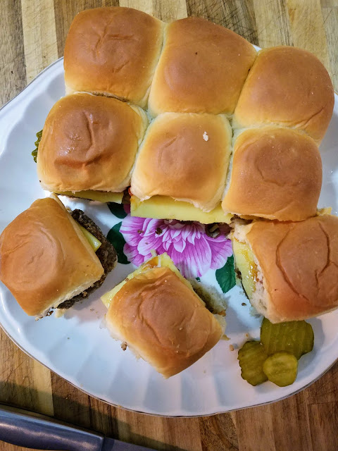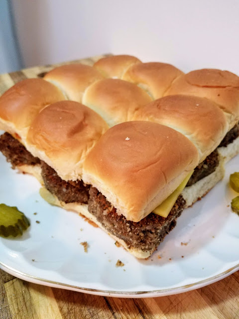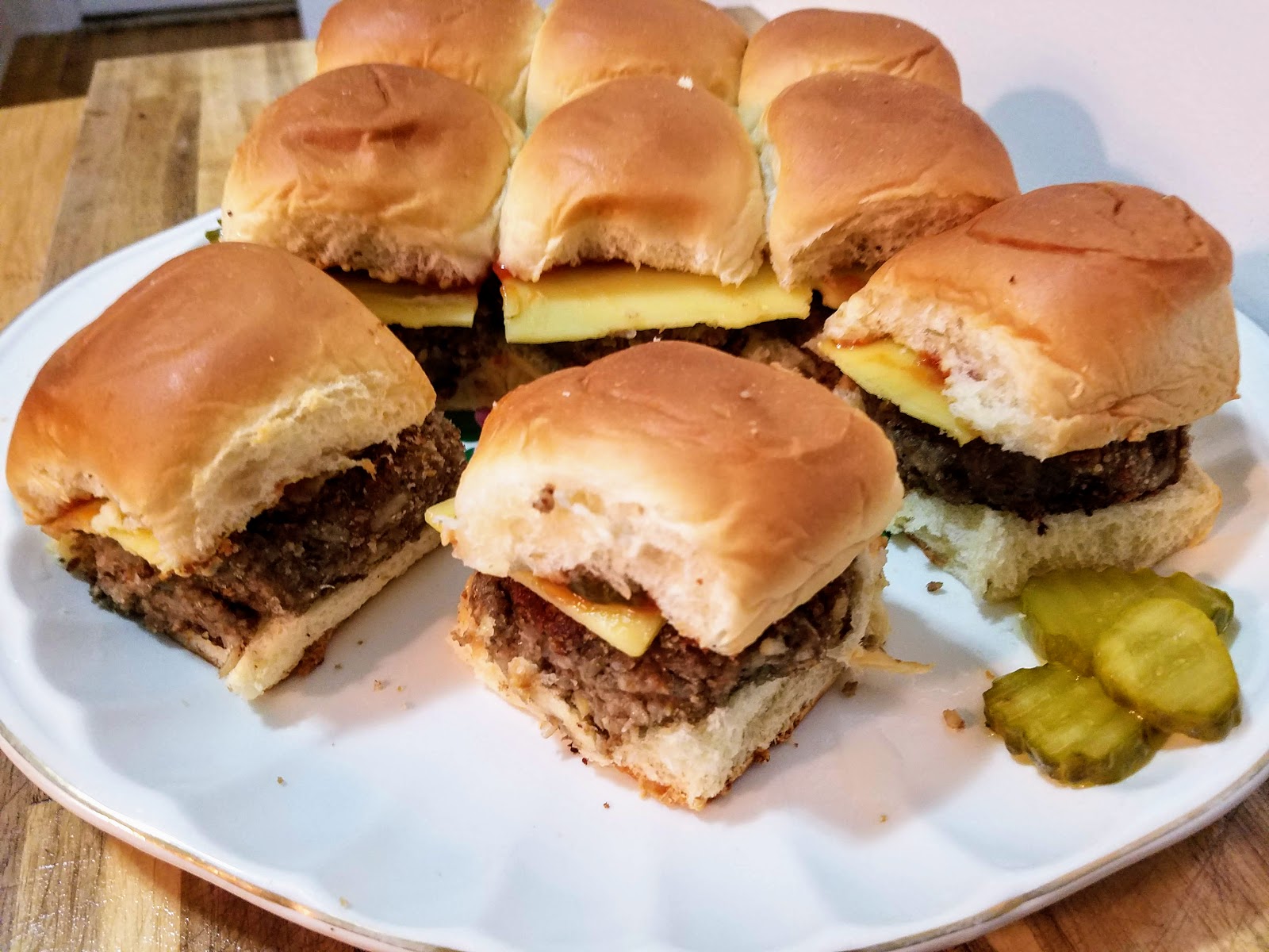 We went pretty simple with our sliders, topping them the classic combination of “cheese” slices, pickles, ketchup, and mustard. I was craving the true cheese burger experience, but you could make these much fancier with lots of different topping combos. Once you have the baby burgers made and the tiny rolls prepared, you can jazz them up to your heart’s content!