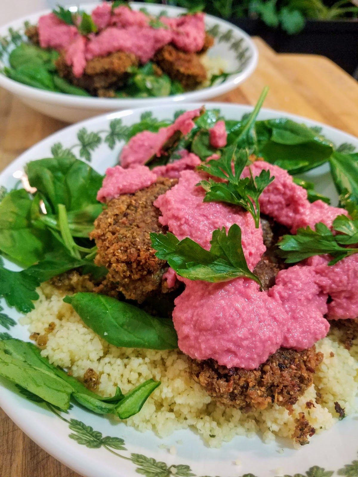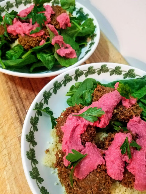 We ate ours with couscous and falafel over fresh spinach. The beet hummus made this meal taste fresh, light, and special.