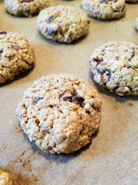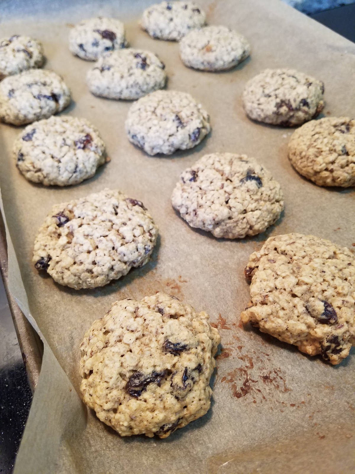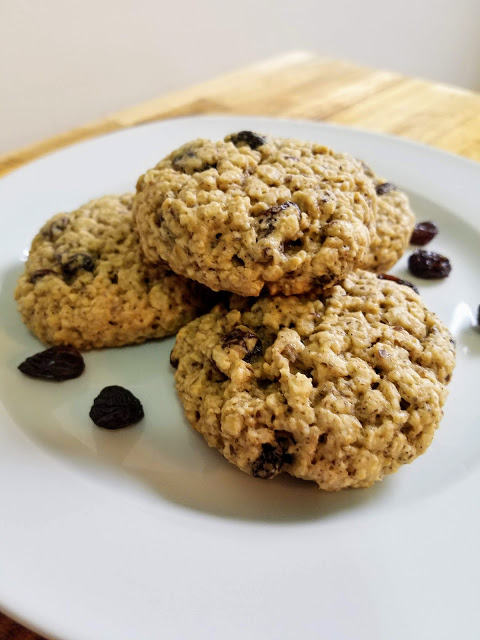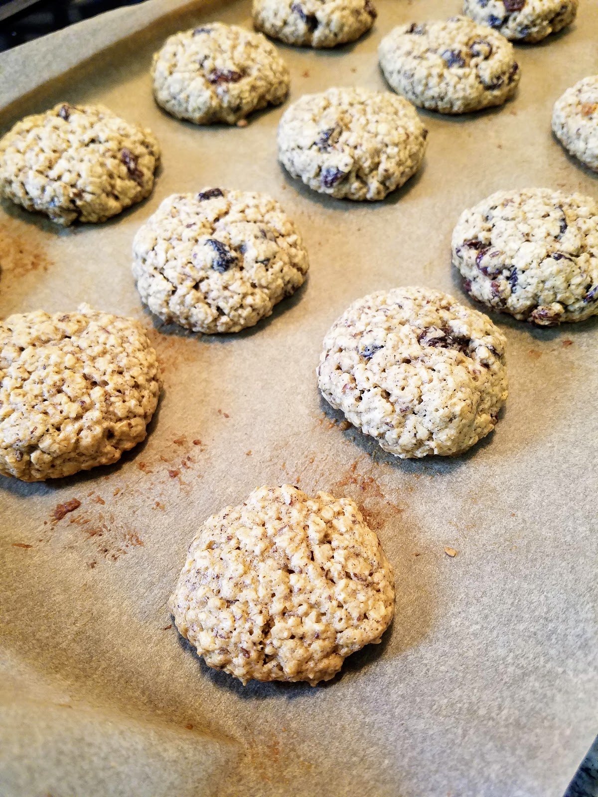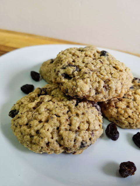 Preheat oven to 350 degrees. In a large bowl with a hand mixer or in a stand mixer, cream the butter, brown sugar, and sugar until the sugar is dissolved. Slowly mix in flour, baking soda, cinnamon, nutmeg, cloves, flax egg, vanilla, and non-dairy milk. Gently fold in oats and raisins. With slightly wet hands, form the dough into balls the size of golf balls and place on a baking sheet lined with parchment paper. With the bottom of a cup that’s slightly wet, flatten the balls slightly. Bake for 12-15 minutes or until golden brown.