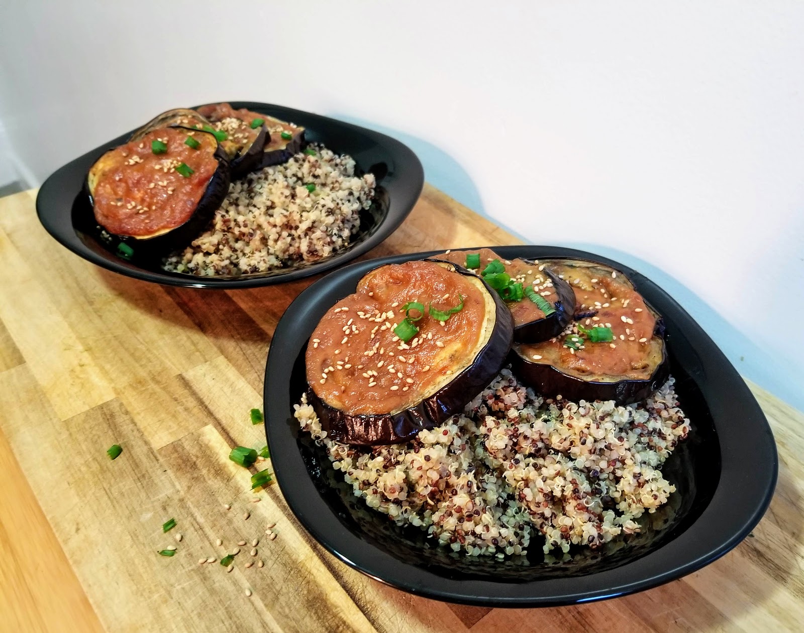 We had our miso eggplant over a big bowl of tri-color quinoa. You could choose to make this as a side dish or serve it over a different grain of your choice. Definitely dont skip on the toasted sesame seeds because they add a nice crunchy texture and nutty balance to the flavors.