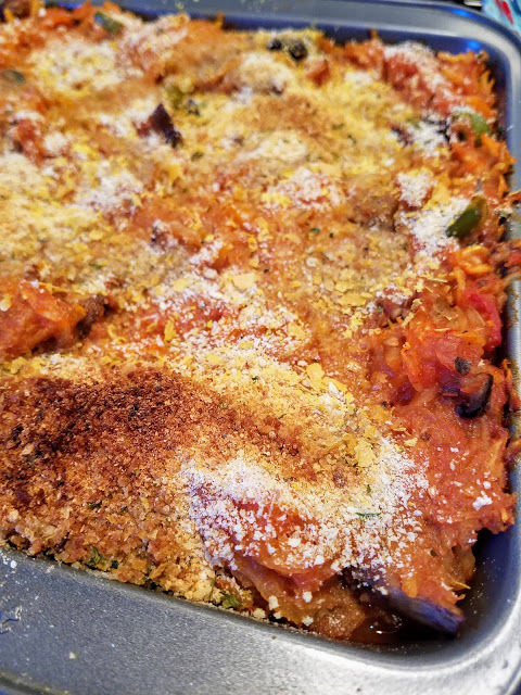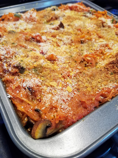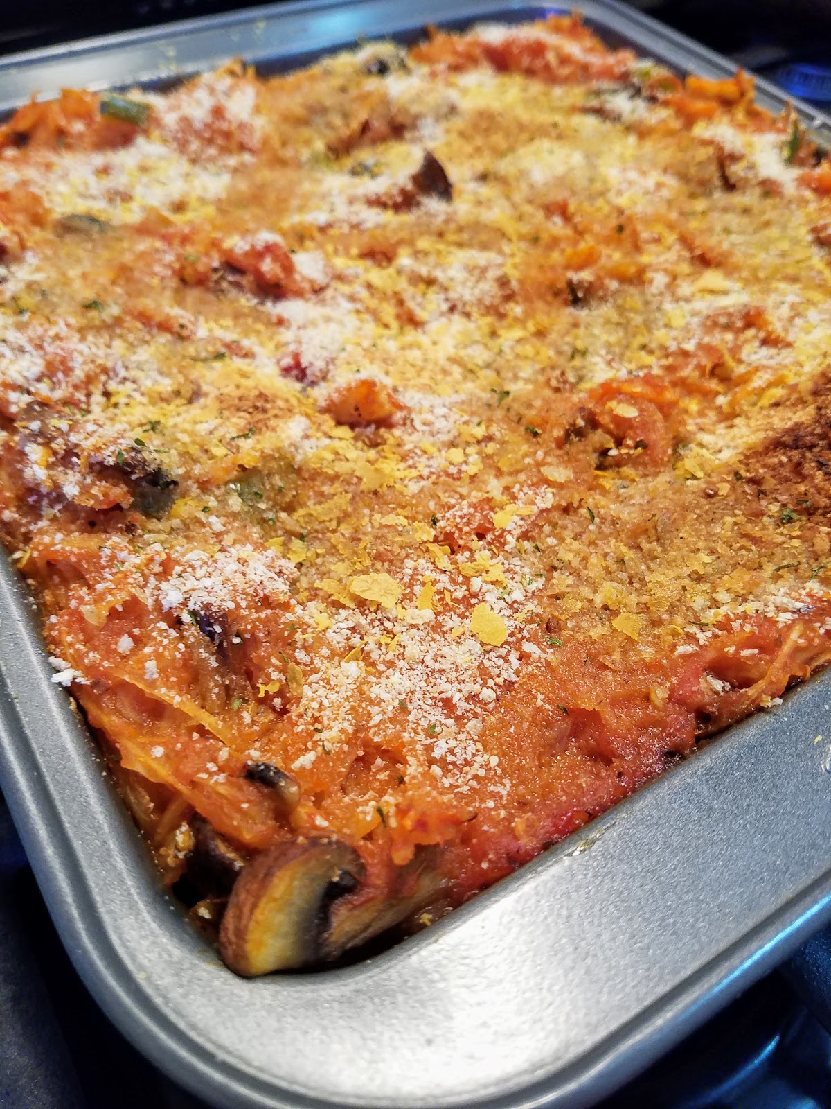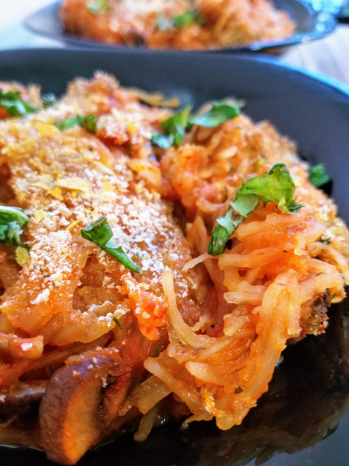 Once spaghetti squash is cooled, use a fork to scrape the squash “noodles” from the external peel. Transfer squash noodles to a large bowl and mix with vegetables, sauce, and a pinch of salt. Pour squash mixture into a 8×8″ pan and top evenly with bread crumbs and nutritional yeast. Drizzle the top lightly with the remaining 1 Tbsp of olive oil and place in the hot oven for 15 minutes. Place under the broiler for an additional five minutes until the top with golden and crispy. Let cool for 5 minutes before serving. Top with fresh basil if desired.