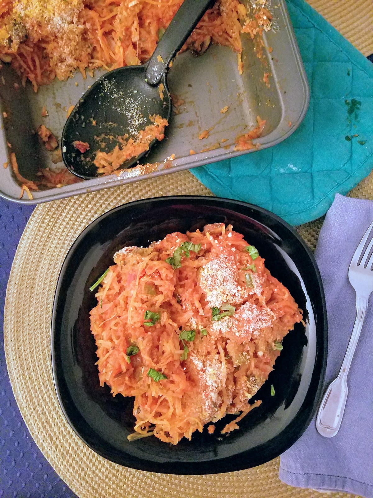 It’s a multi-step recipe because you have to roast the squash first, and then assemble and bake the casserole. But, it’s definitely worth it for both the health and taste factors of this dish! In addition to the spaghetti squash, which is super good for you, I also added lots of other nutrient-packed ingredients to the casserole. You can thank me later!
