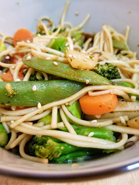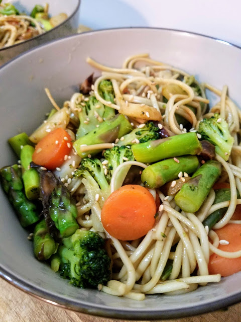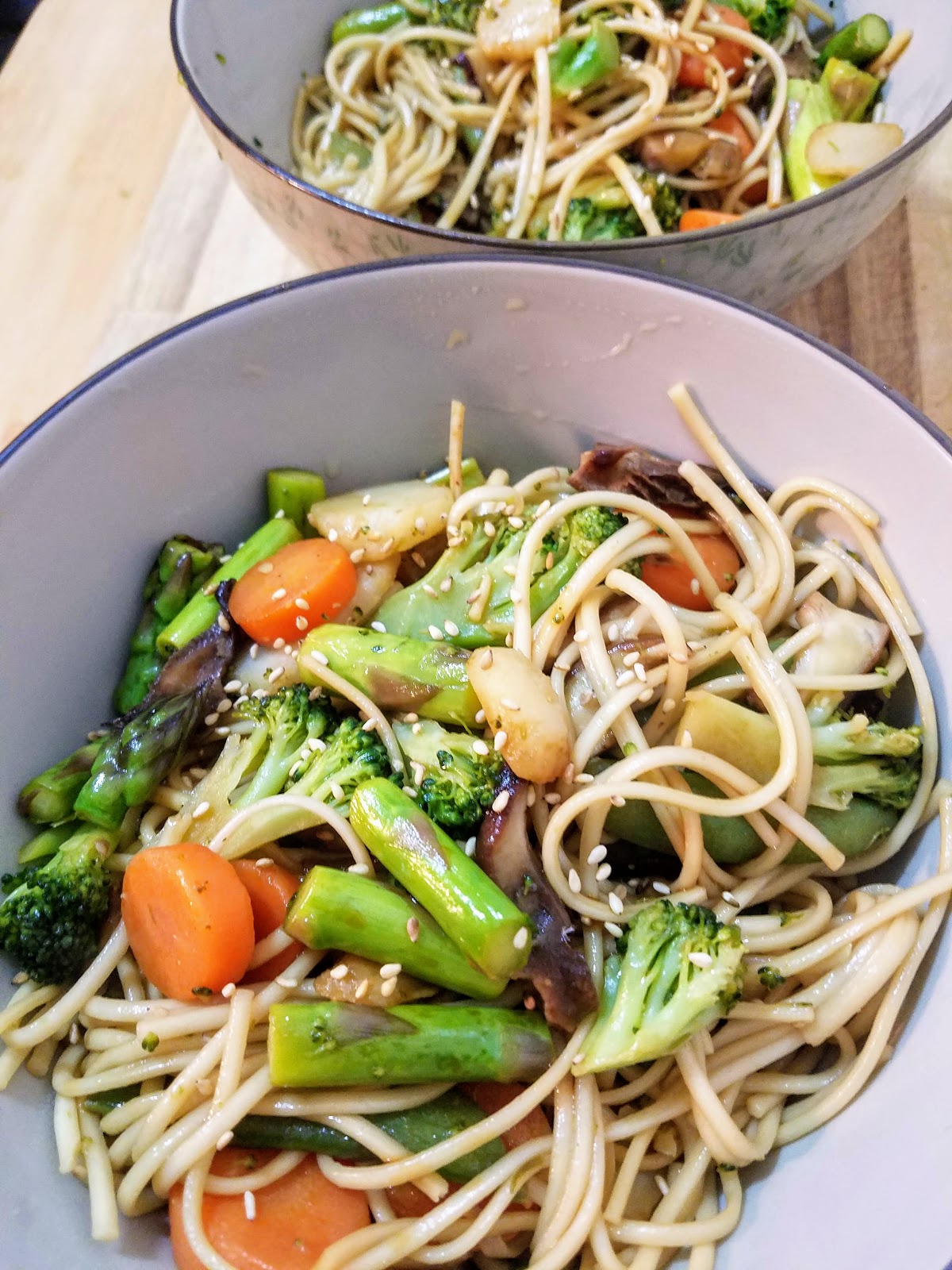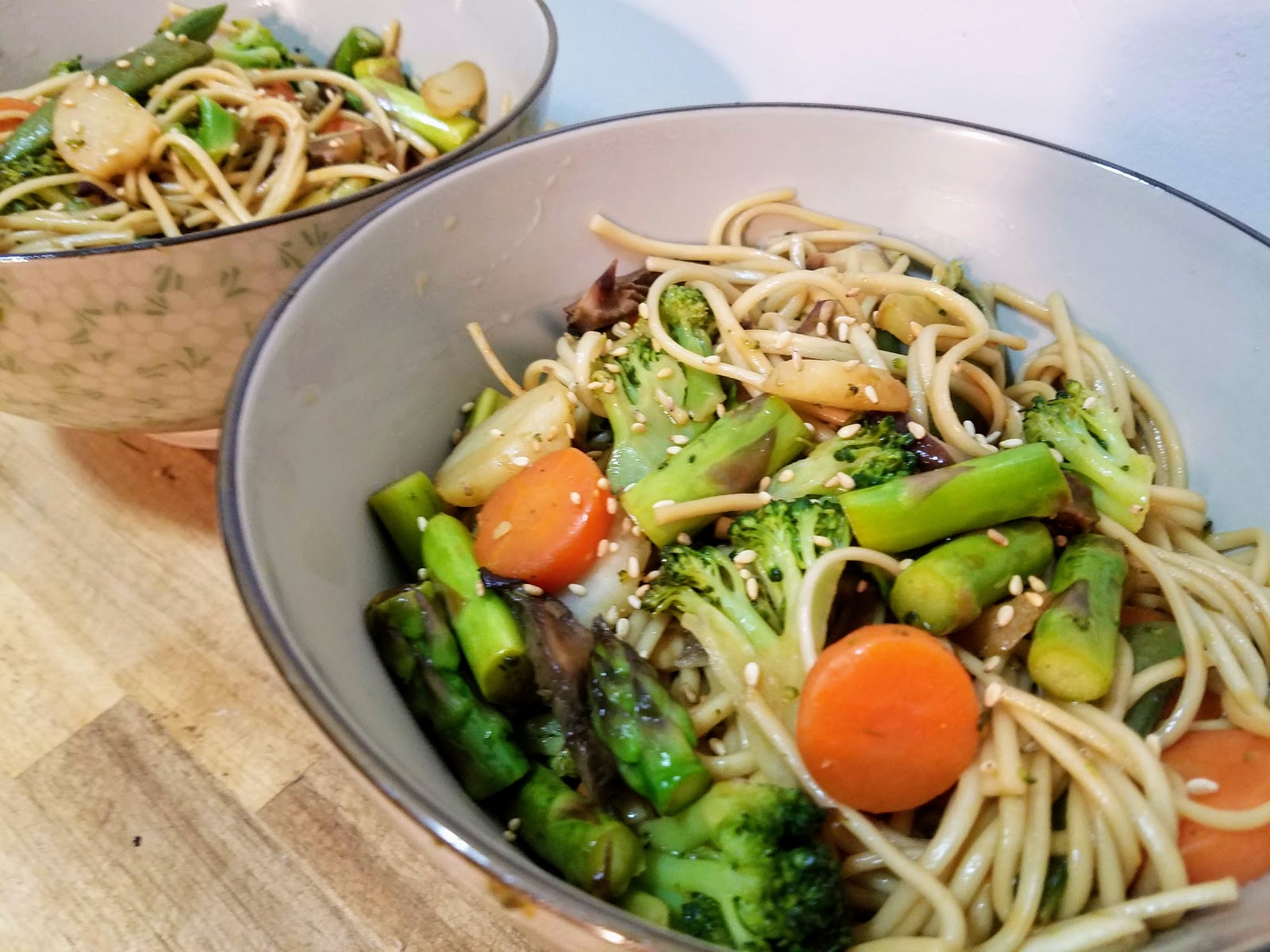 In a bowl, mix together soy sauce, 1/2 Tbsp sesame oil, and sugar, and set aside. Heat 1 Tbsp sesame oil in a large wok or skillet over high heat. Add frozen vegetables to the hot pan. Stir fry until fork-tender, about 4-5 minutes, adding asparagus mid-way through. Add the shitake mushrooms and cook for another 2-3 minutes. Pour in the rice wine vinegar and loosen the browned bits up off the bottom of the pan. Add the cooked noodles and the soy sauce mixture, adding more sauce if needed. Toss to combine and serve immediately