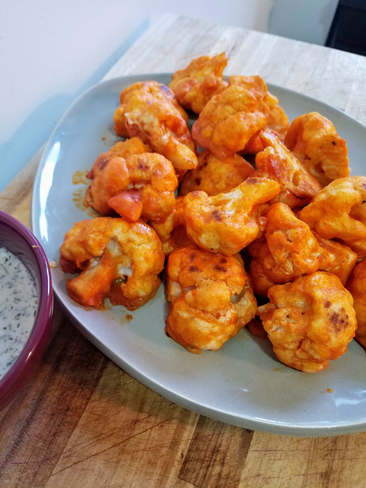 Hubby quickly whipped up a vegan ranch dipping sauce by Karissa’s Vegan Kitchen because we happened to have all the ingredients on hand. I highly recommend serving these with a vegan ranch or blue cheese dressing if you can find it or make it!