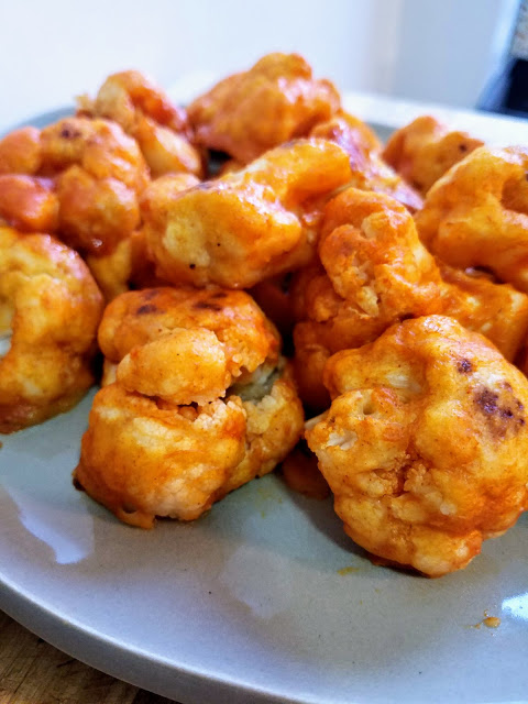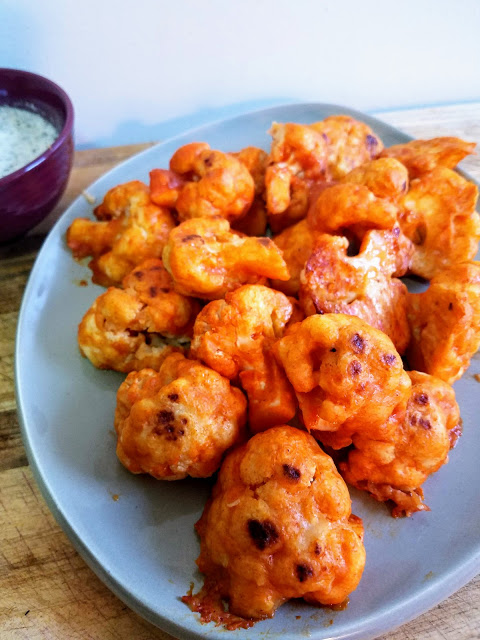 Preheat the oven to 400 degrees. Line a baking sheet with parchment paper. In a large mixing bowl, mix together the almond milk, water, flour, and spices. The batter should be thick and be able to coat the cauliflower without dripping. Dip the florets in the batter, shaking off the excess batter before placing them on the baking sheet in a single layer. Bake for 20 minutes or until golden brown, flipping the florets over halfway. Meanwhile, in a small saucepan over low heat, add the butter and mix in the wing sauce. Remove from the heat just as it starts to melt. Set aside. Once the cauliflower is done, put the baked florets into a mixing bowl with the wing sauce and toss to coat evenly. Return cauliflower to the baking sheet and bake in the oven for another 10-15 minutes or until reached desired crispness. Serve with vegan ranch dressing if desired.