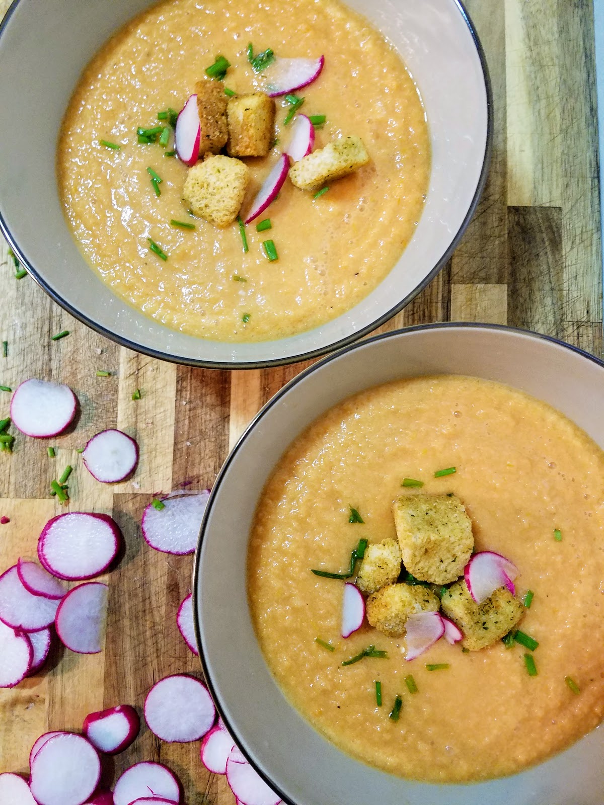 I suggest pairing it with avocado or radish toast (recipe coming soon! see pics here), or just topping it with croutons and fresh chives. It’s also cute and yummy served as an hors d’oeuvres gazpacho “shot” at parties! Give it a try and let me know what you think!