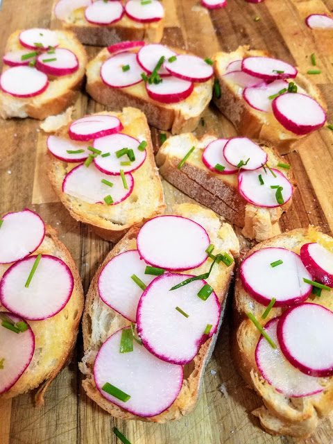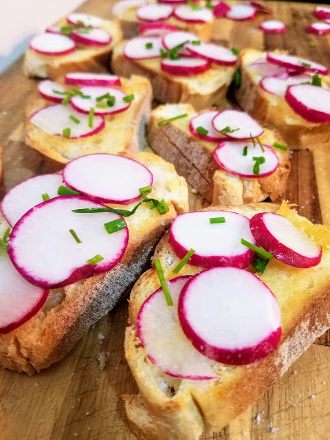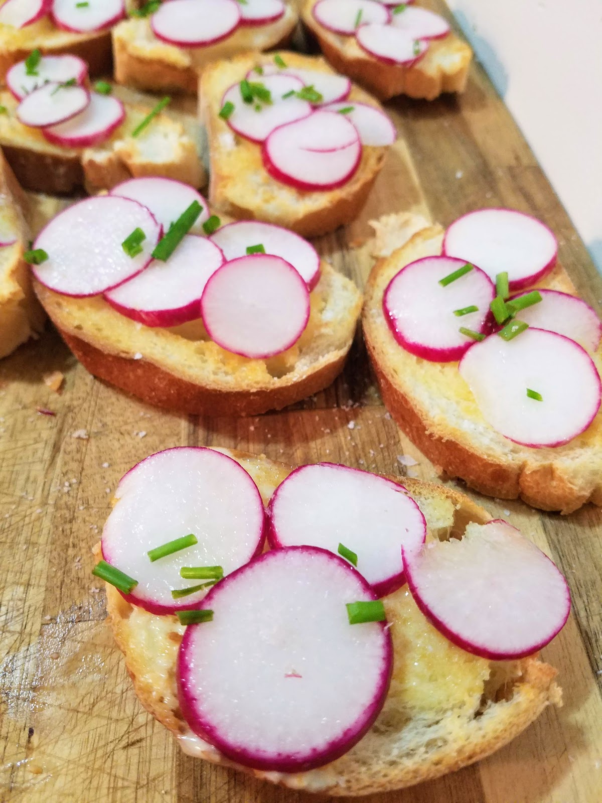 Want to feel European? Make this super simple but surprisingly delicious snack/appetizer of radish + butter toast. The key is to slice the radishes really thin (use a mandolin if you have one!) and use lots of butter and salt. A healthy sprinkle of salt takes away the sharp bite of the raw radish — make sure to put the salt on the radishes, not the butter.