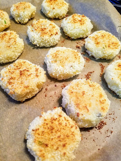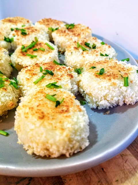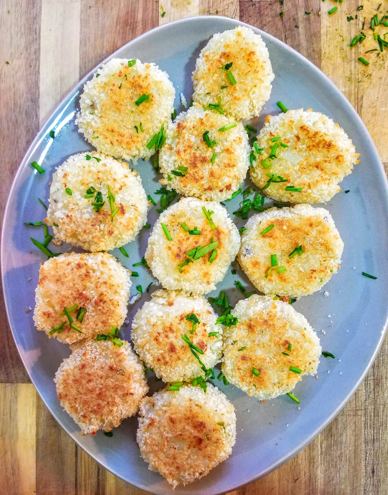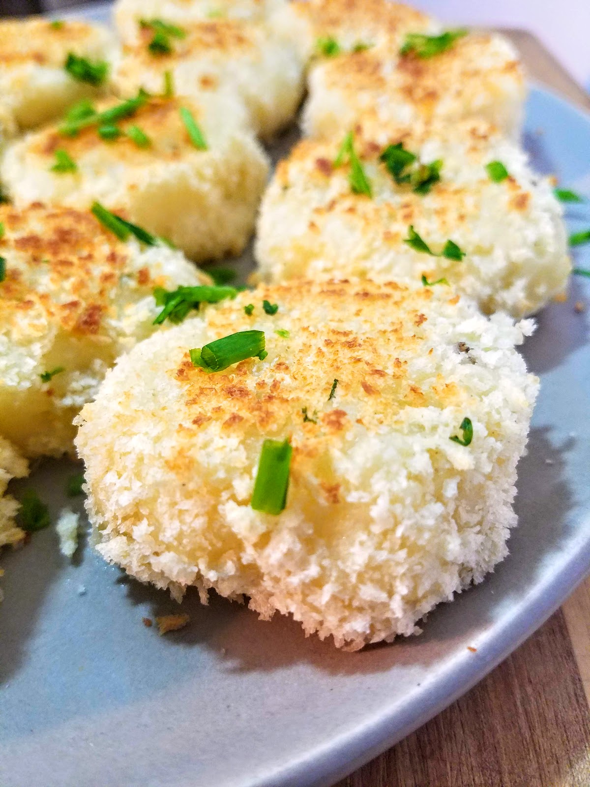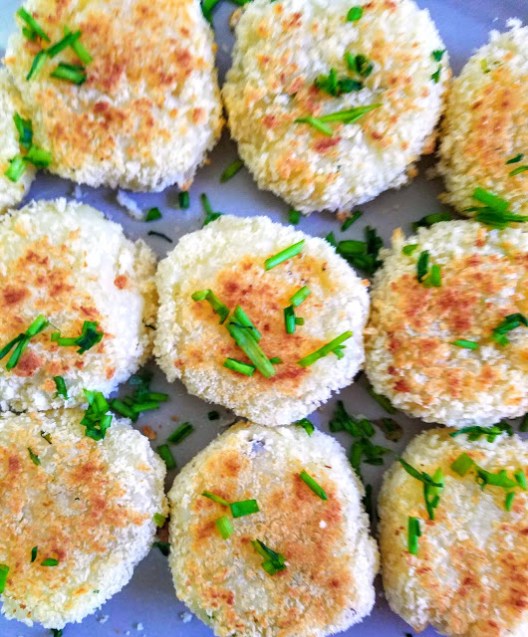 Line a baking sheet with parchment paper. Place remaining almond milk in a shallow bowl, and panko breadcrumbs in a separate bowl. Using your hands, form the potato mixture into small croquettes 2 inches in diameter. Dip each croquette in almond milk and then coat with panko and place on the prepared baking sheet. Bake for 20-25 minutes, turning halfway (or when the bottom has turned golden brown). Garnish with more fresh chopped chives if desired.