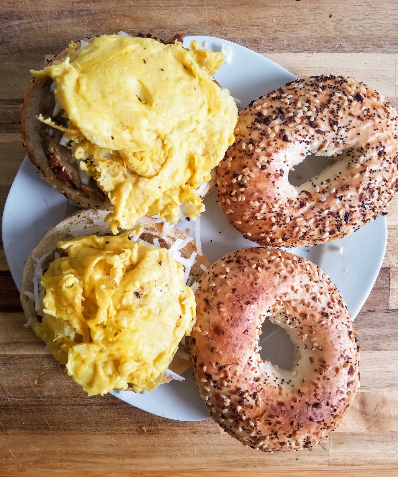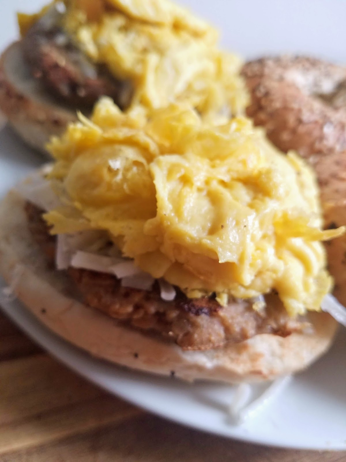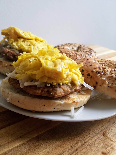 When I realized that there was a decent egg substitute available in Whole Foods called Just Egg, I was so excited to try it out on a bagel and make a decent vegan version of one of my all time favorite foods. I paired the Just Egg scrambled eggs with Gimme Lean veggie breakfast sausage patties and my go-to Daiya cheese shreds (a slice would’ve been better but I only had shreds in the fridge). Of course we had our sausage egg and cheese sandwiches on everything bagels because… duh! Doesn’t even need an explanation.