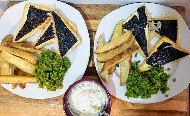 Once oil is hot, dip tofu fillets into the batter and carefully lower into the oil. Fry for about 5 minutes or until batter is golden brown. Drain on paper towel and sprinkle with salt. Serve with chips and mushy peas, and vegan tartar sauce if you wish!