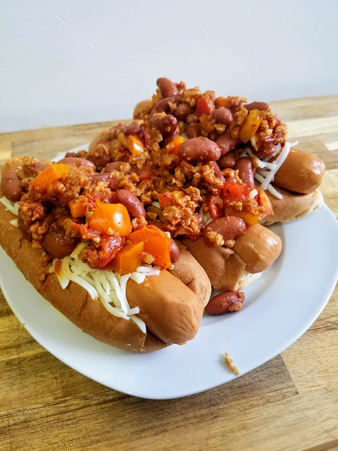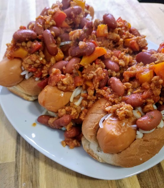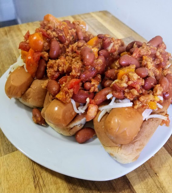 In a large saucepan over medium high heat, add 1 Tbsp olive oil, garlic, and red pepper and let cook for 2 minutes, stirring occasionally. Add Gardein crumbles and cook for another 2-3 minutes, stirring frequently. Add kidney beans and diced tomatoes, along with chili powder, paprika, and red pepper flakes. Stir to incorporate, and let simmer for 8-10 minutes. Meanwhile, cook hot dogs as instructed on packaging. Serve hot dogs in buns and spread cheese shreds over top, and then add the hot chili to melt the cheese.