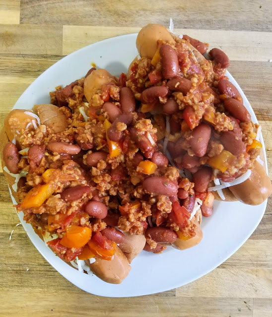 I topped my vegan ‘dogs with some of my quickie chili from when I made chili-topped hash browns (see here), and a little bit of vegan cheese for good measure. It was everything I was craving and more.