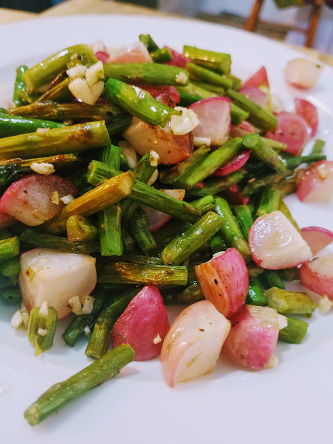 I roasted my radishes with asparagus and flavored them with fresh garlic, olive oil, and salt and pepper. You could substitute the olive oil with melted vegan butter, but I think the olive oil has a greater depth of flavor that comes through during the roasting process.