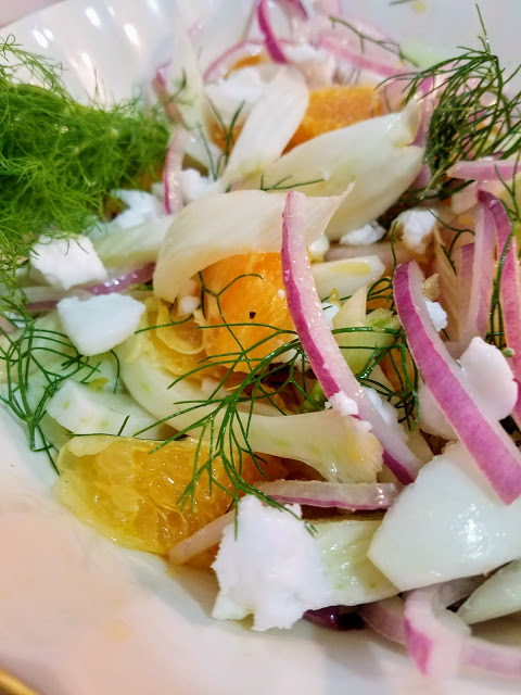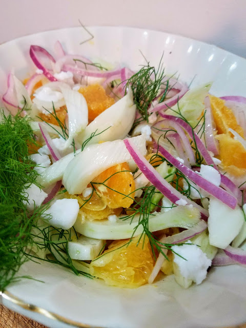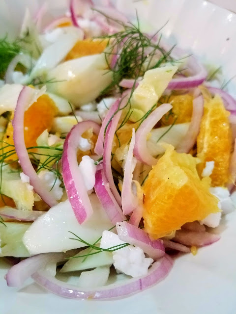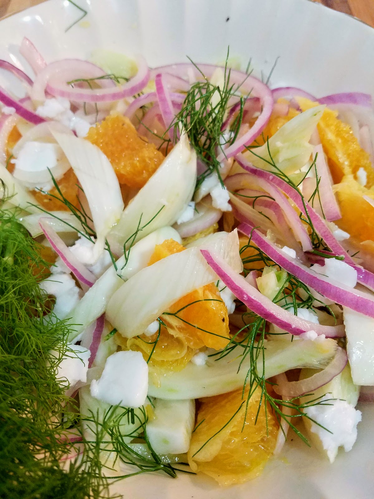 In a small bowl, add red onion slices and orange juice and toss to coat. Let marinate for at least 5 minutes while you prepare the orange and fennel. To prepare the fennel, cut the fennel bulb into thin wedges, removing the tough center core. In your serving bowl, add fennel wedges and a few small fronds, orange wedges, and marinated red onion. Whisk together olive oil and white vinegar and pour over salad. Season to taste with salt and pepper, and sprinkle with vegan feta if desired. Toss to incorporate dressing and serve immediately or refrigerate until it’s time to eat.