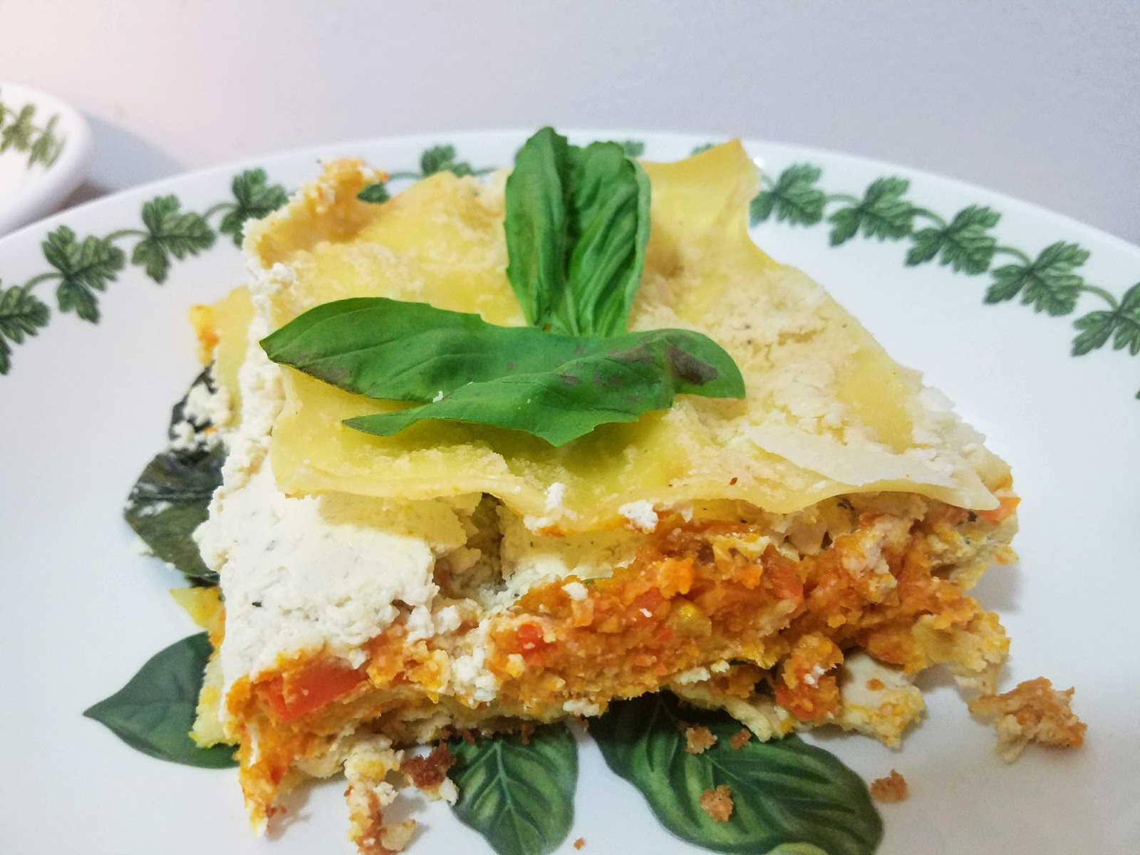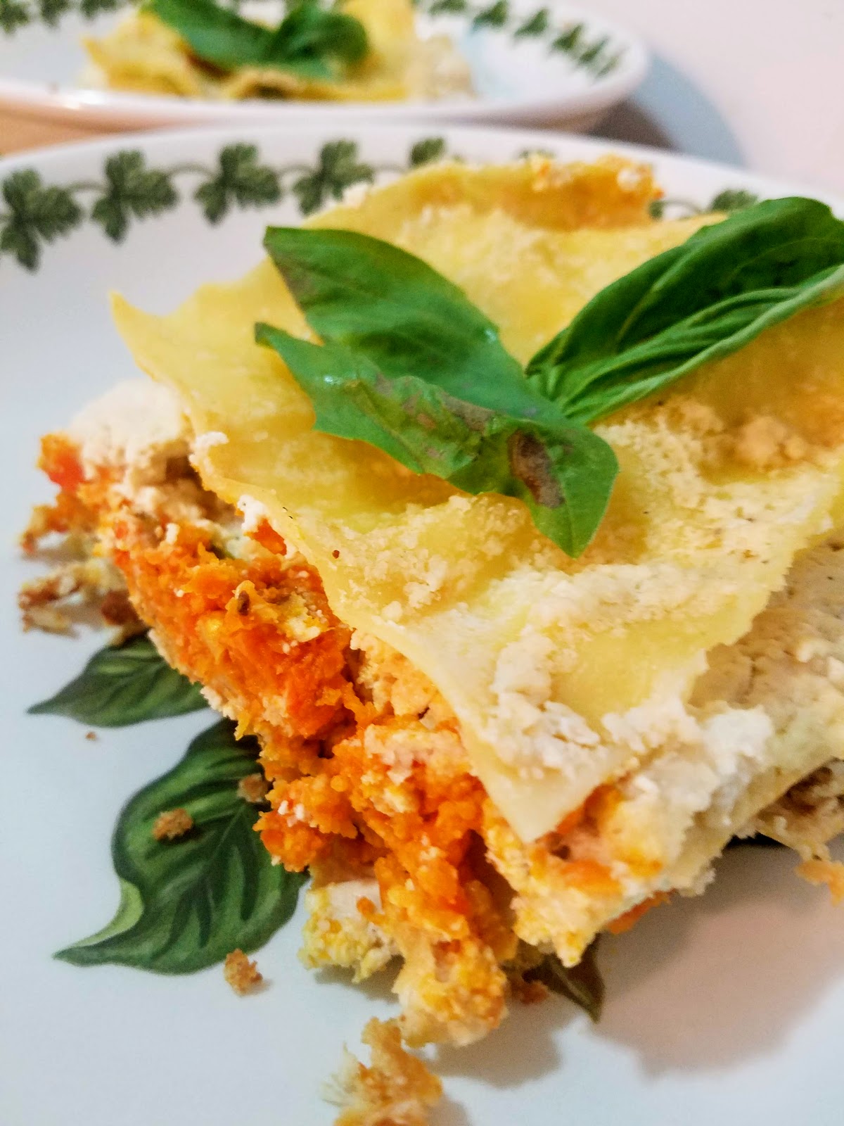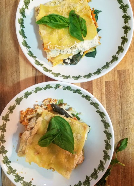 To assemble the lasagna, coat the bottom of an 8×8″ pan with a thin layer of the alfredo sauce. Top with two lasagna noodles. Next add another layer of alfredo sauce and half of the ricotta mixture. Then add two more noodles, a layer of sauce, the sweet potato puree, a layer of basil leaves, and another layer of sauce. Add two more noodles, a layer of sauce, the remaining ricotta, two more noodles, and pour over any remaining sauce. Cover with foil and bake for 45 minutes, and uncover for an additional 5 minutes. Let sit for 5 minutes before serving. Garnish with additional basil leaves.