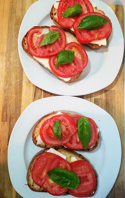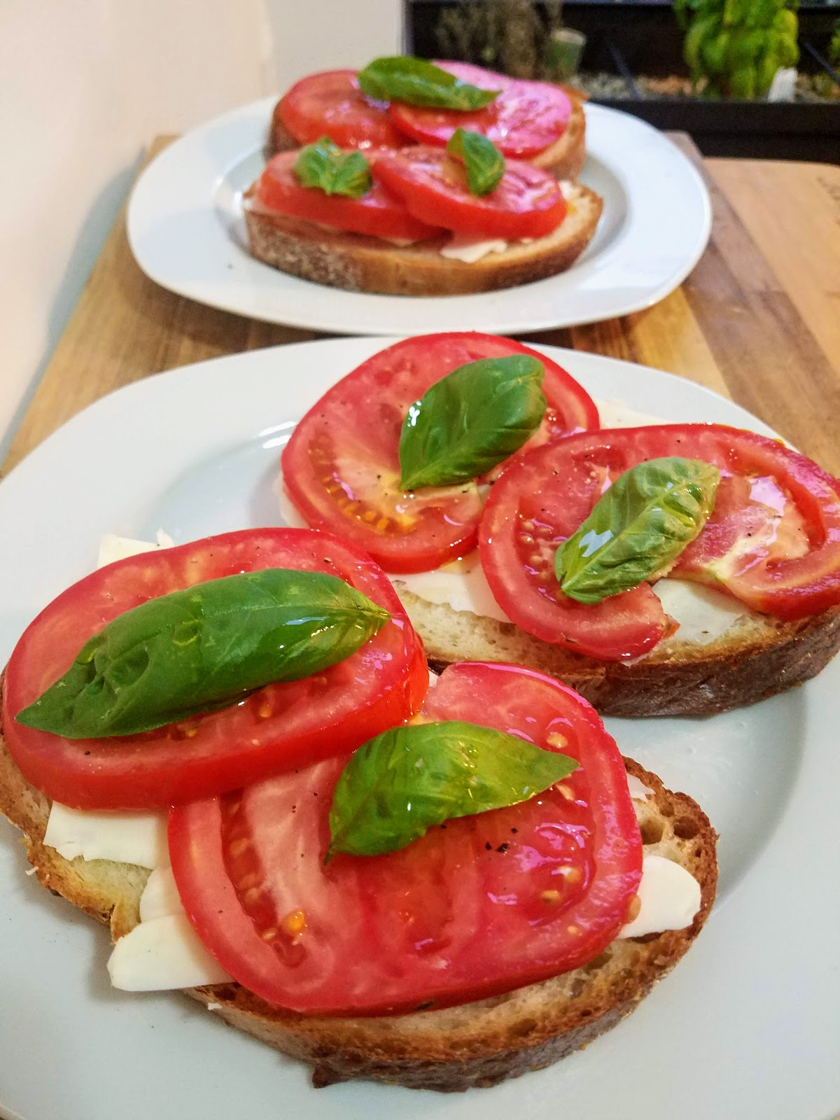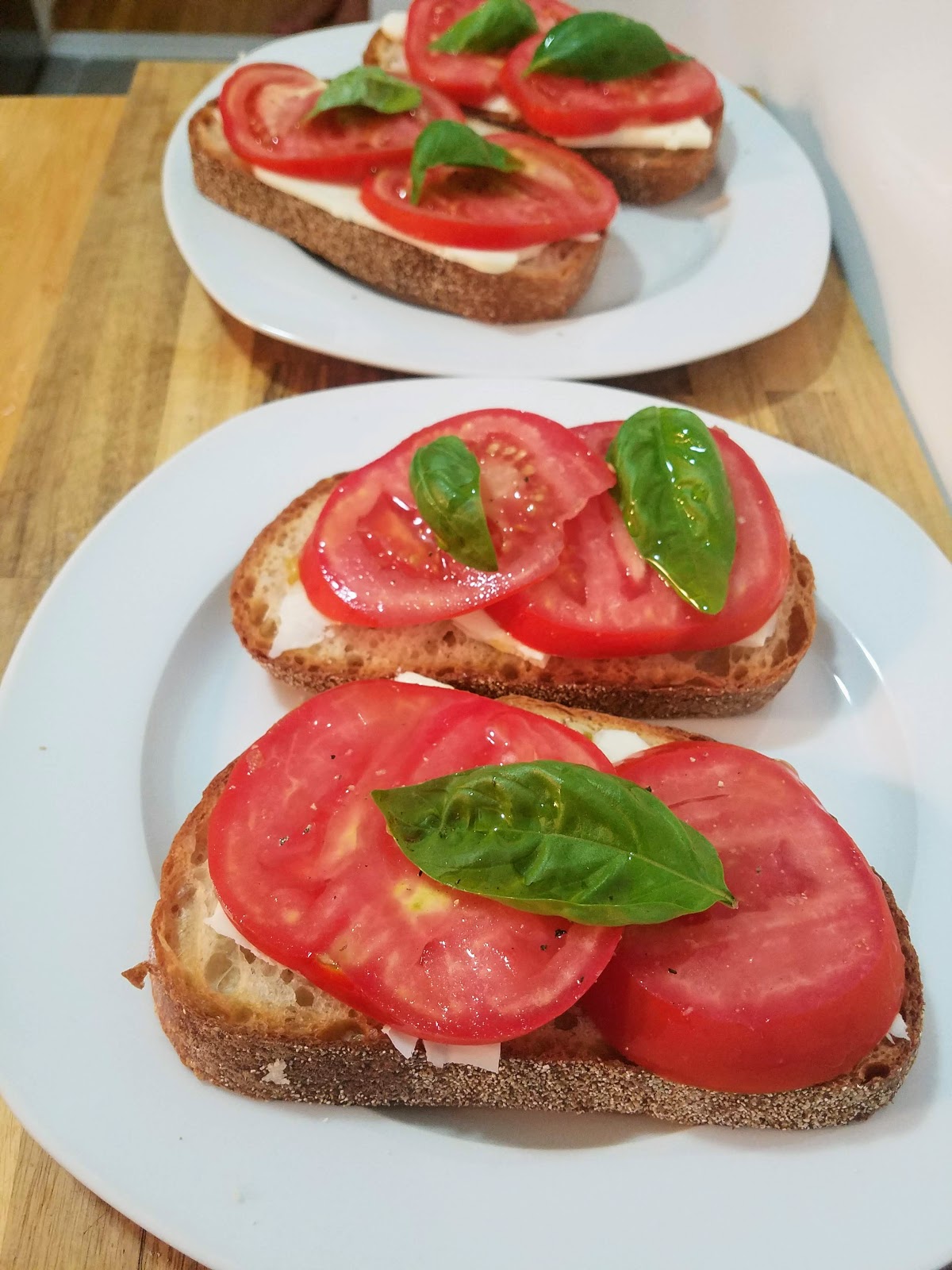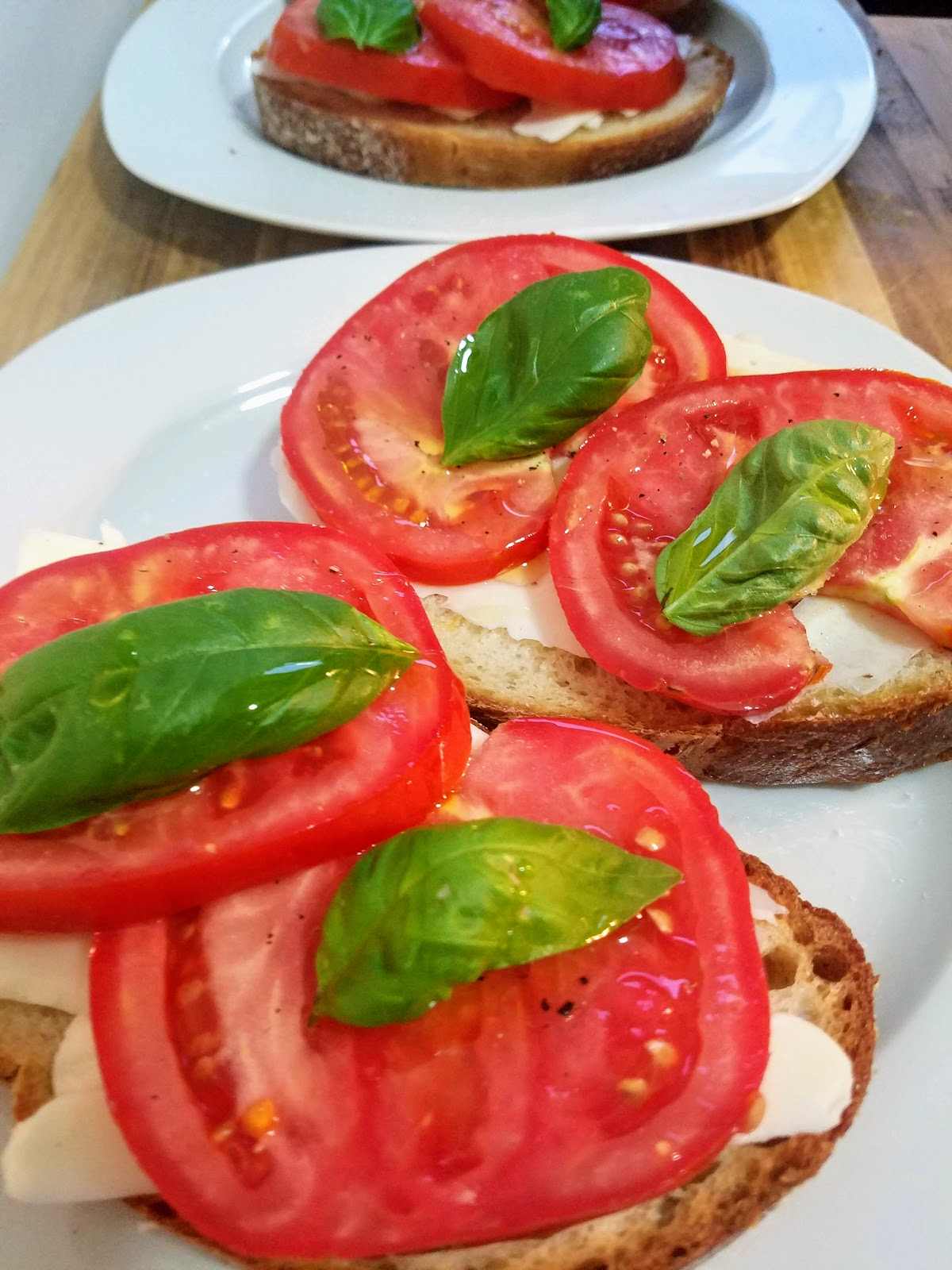 Build your open faced sandwich by adding a layer of thinly sliced vegan mozzarella, a layer of thinly sliced tomato, a healthy pinch of salt and fresh ground pepper, a few leaves of basil, and a drizzle of olive oil. Enjoy!