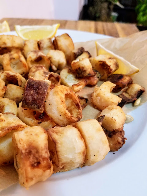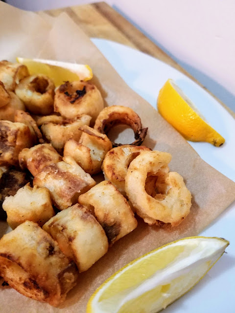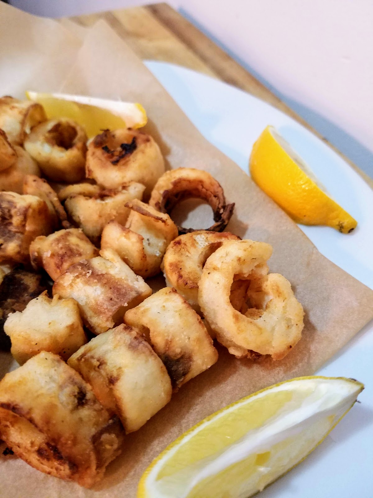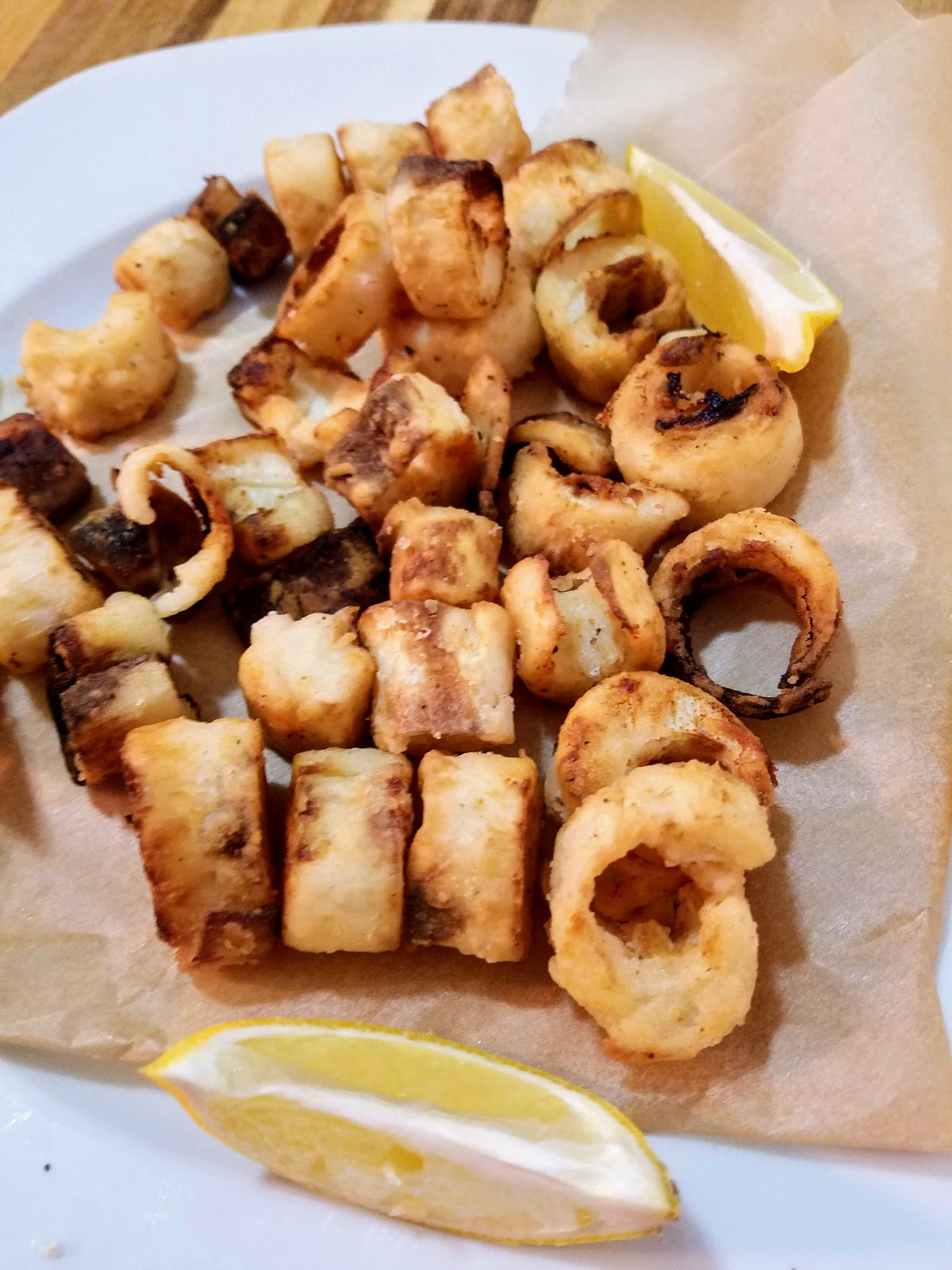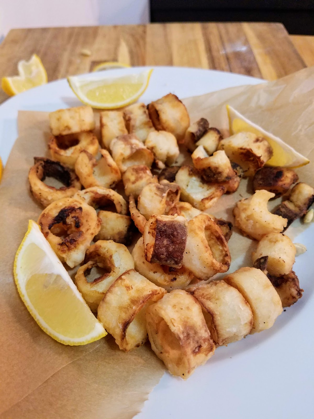 In this recipe, I separated the flaky circles of the hearts of palm and fried them to mimic the shape and texture of calamari. I added Old Bay seasoning to the fry batter to amp up the seafood experience even more. We whipped up a quick vegan tartar sauce (veganaise, relish, lemon juice, salt) and drizzled ours with lemon juice to complete the dish.