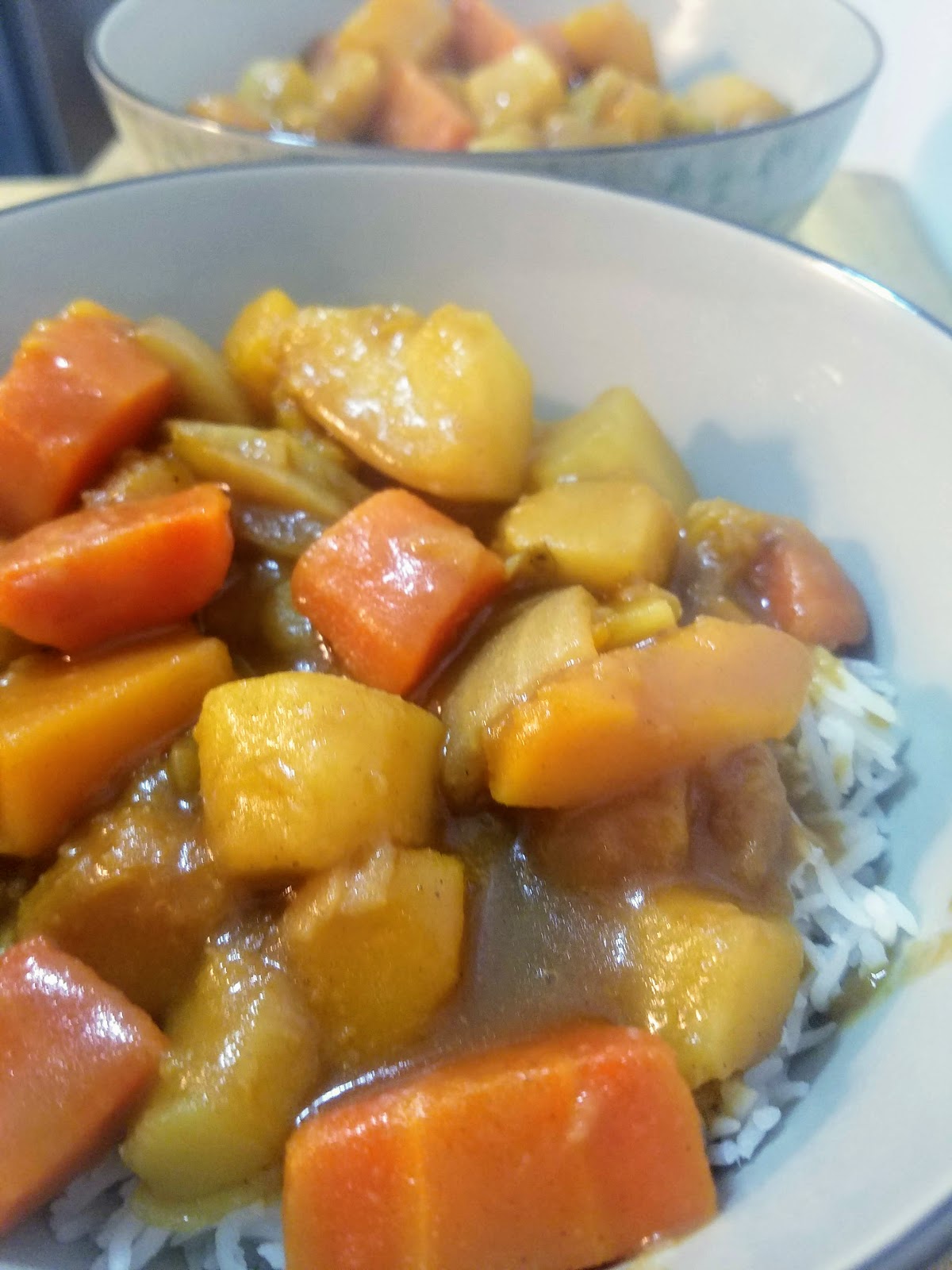 This dish is typically made with meat, but I decided to make a vegetable stew Japanese curry with potatoes, carrots, butternut squash, and onion. It takes about 30 minutes of sauteing and simmering to get the veggies all tender and soft. We served ours over starchy white rice so it could sop up all the thick curry sauce.