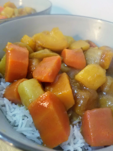In a large deep Dutch oven or skillet over medium heat, add 2 Tbsp olive oil. Saute potatoes, carrots, and onion for about 5 minutes. Then add butternut squash and saute for another 5 minutes, or until the onions have turned light brown. Add four cups of water and bring to a light simmer. Lower heat and simmer for 8-10 minutes or until vegetables are softened. Add Japanese curry blocks and stir to dissolve. Simmer for another 5 minutes or until the sauce has thickened. Serve over rice.