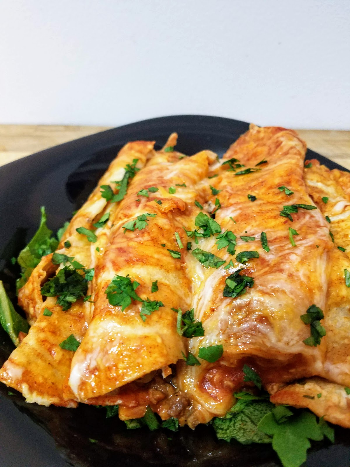 To assemble, spread a thin layer of enchilada sauce in the bottom of a 8″ square baking dish. Place tortillas in the preheating oven for 1 minute to soften. Scoop about 1/4 cup bean mixture into each tortilla and roll them up tightly. Place the rolled tortillas in the baking dish seam-side down. Using a pastry brush, brush the ends of each tortilla with enchilada sauce. Then, drizzle sauce in a thin even layer over the enchiladas. Sprinkle the remaining cheese over the top, cover with foil, and bake for 20 minutes. Uncover and bake for 2-3 minutes until the cheese is slightly brown. Garnish with chopped cilantro and serve.