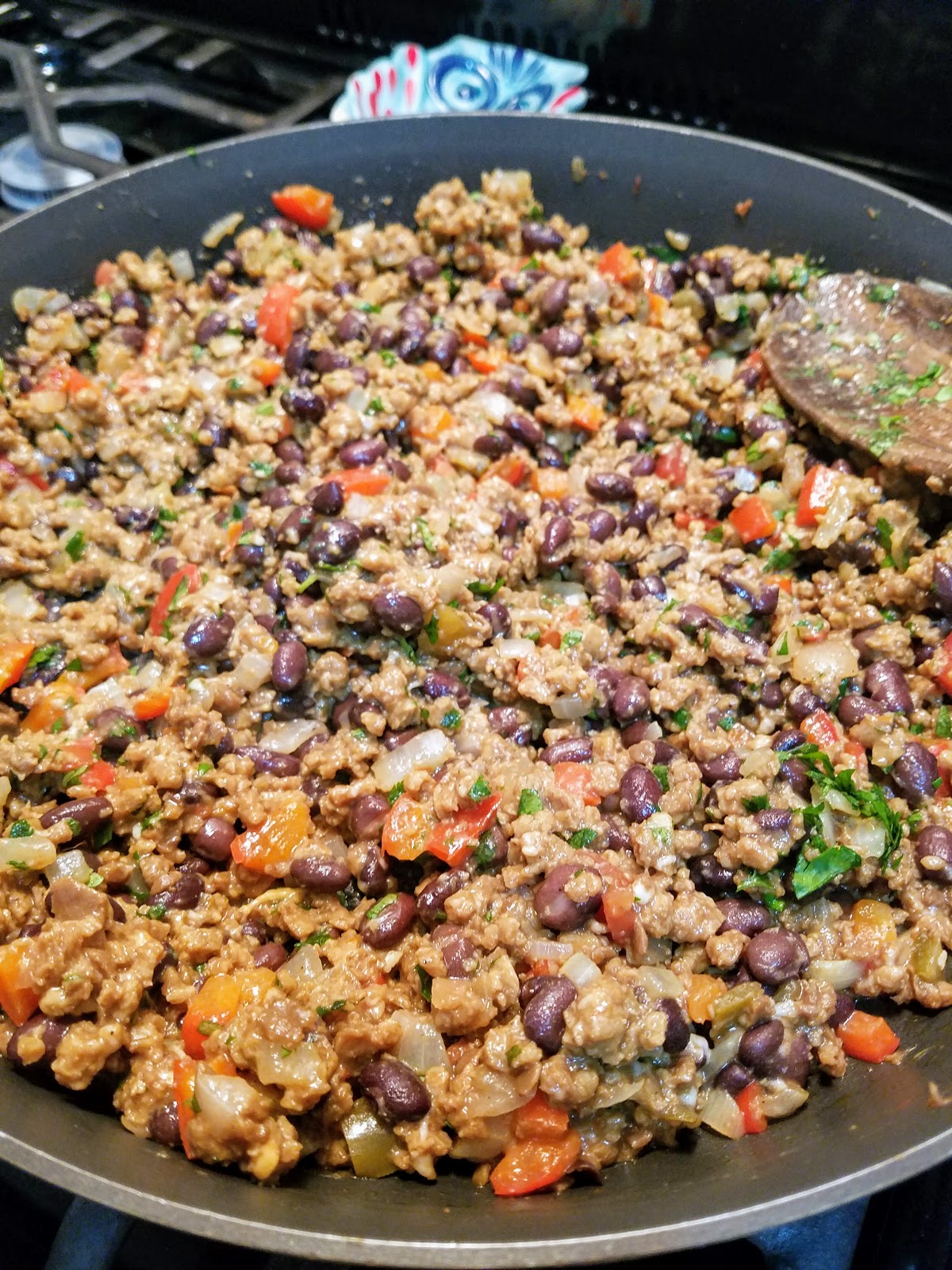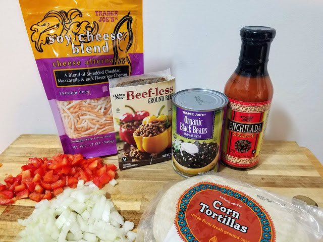 For this meal, I basically went to Trader Joe’s and was inspired by their vegan offerings, out of which this enchiladas recipe was born! They have an awesome vegan enchilada sauce and a vegan cheese blend that was perfect for this purpose. I also used their beef-less ground beef, some fresh veggies, black beans, and corn tortillas (see below).
