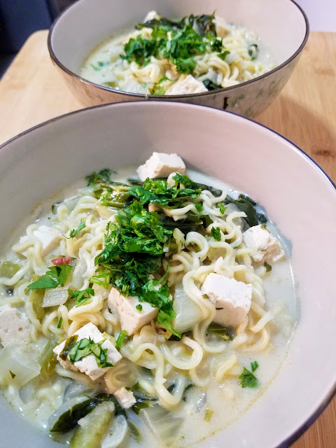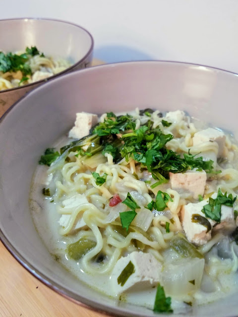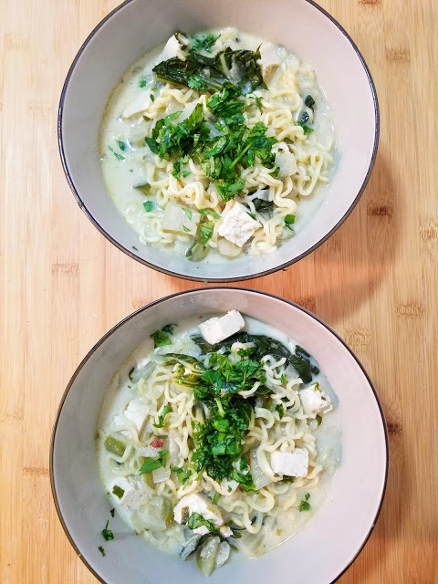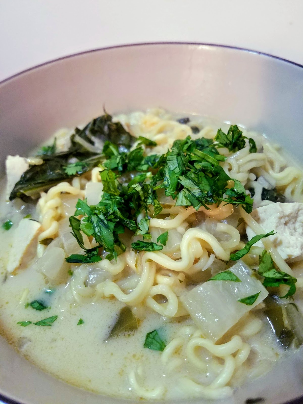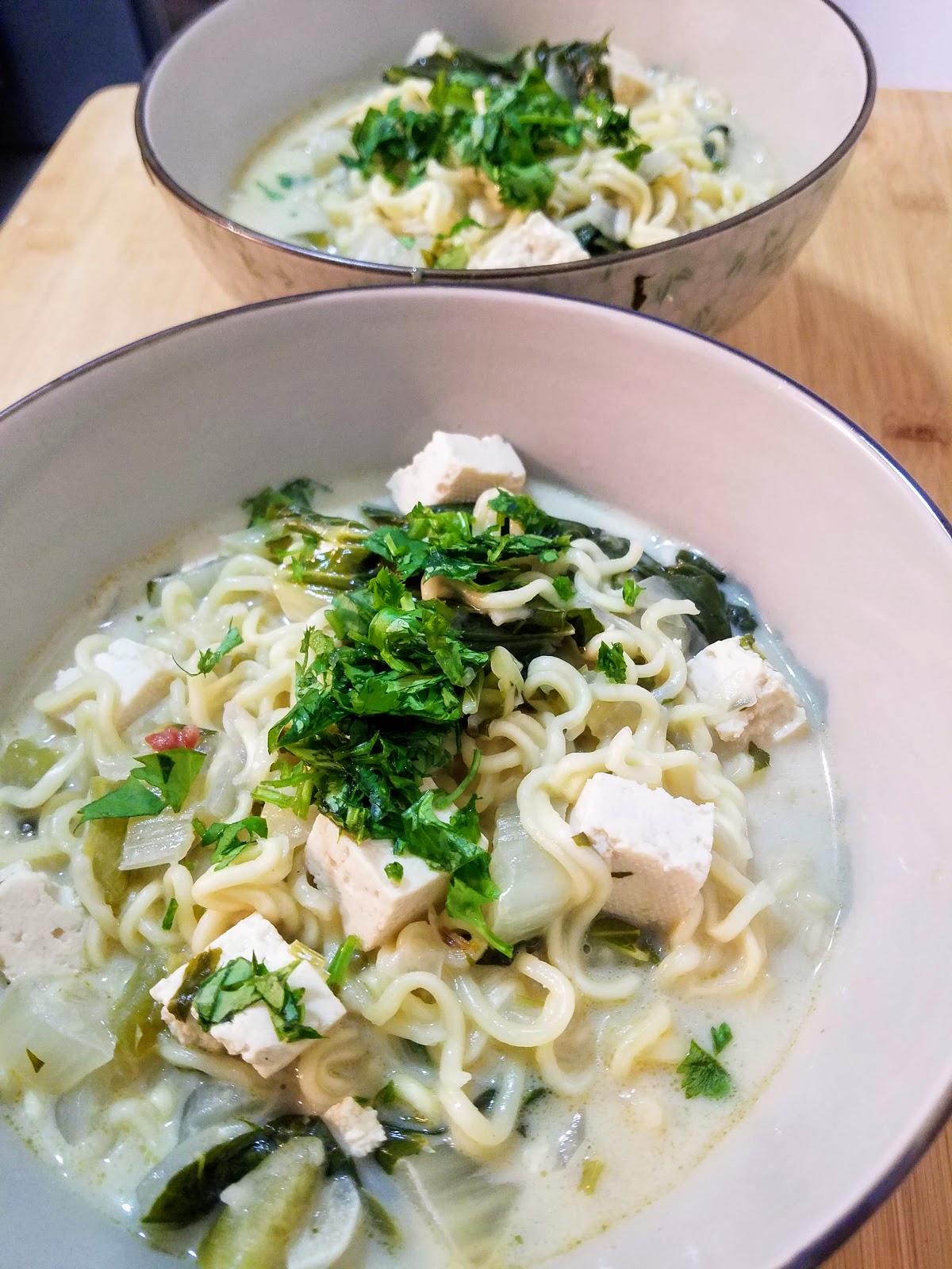 The base is vegetable broth and coconut milk, and the goodies inside include cubed tofu, peppers and onion, Chinese cabbage bok choy, packets of dried ramen noodles (yes, really!), and lots of flavors.