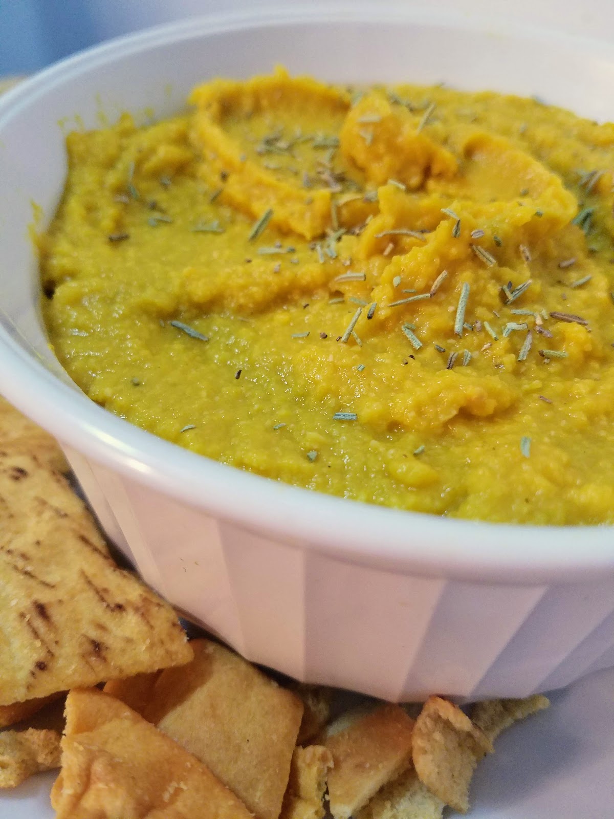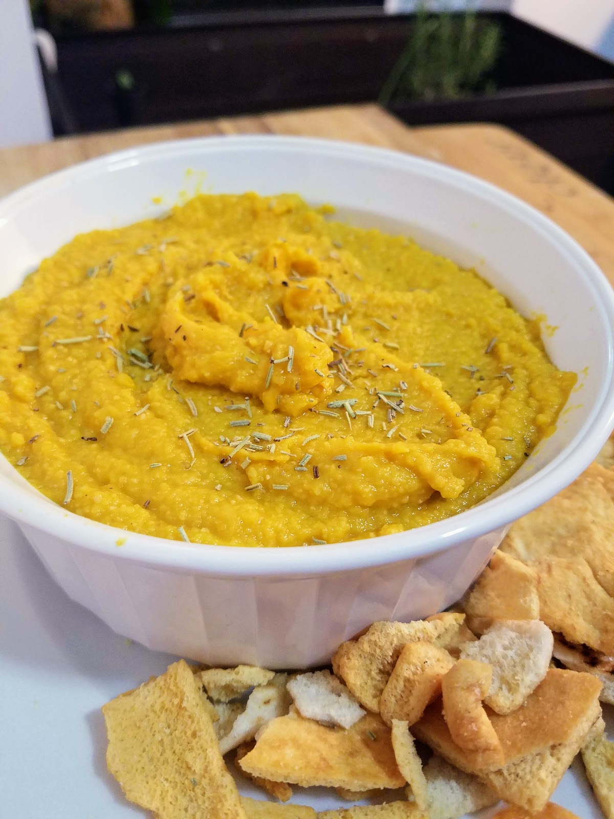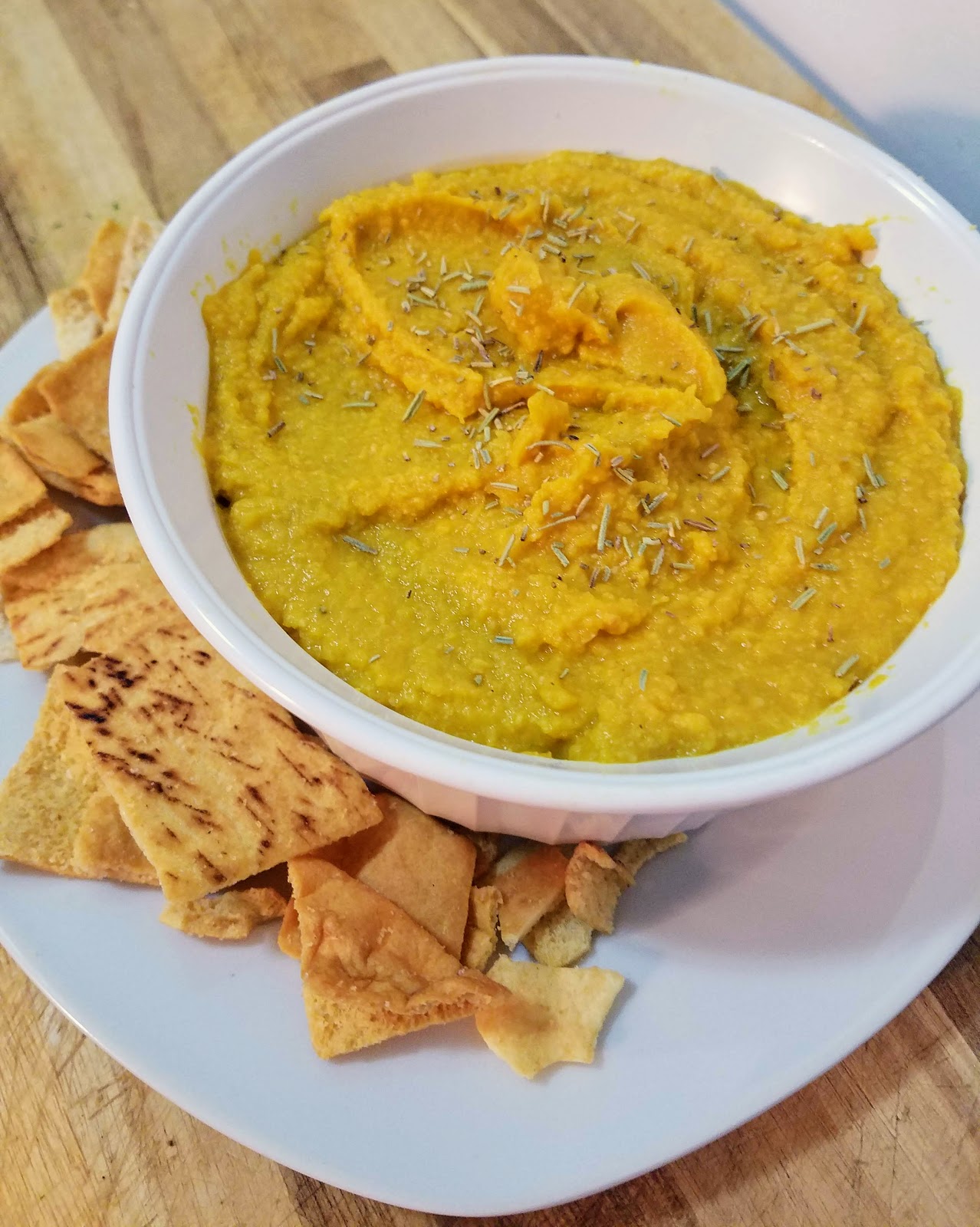 We served our homemade pumpkin hummus with lightly salted pita chips, but it would be fantastic with raw veggies or lots of different fancy crackers, whatever your heart desires! It tastes and looks so festive that you and your guests will definitely love snacking on this unique dip.