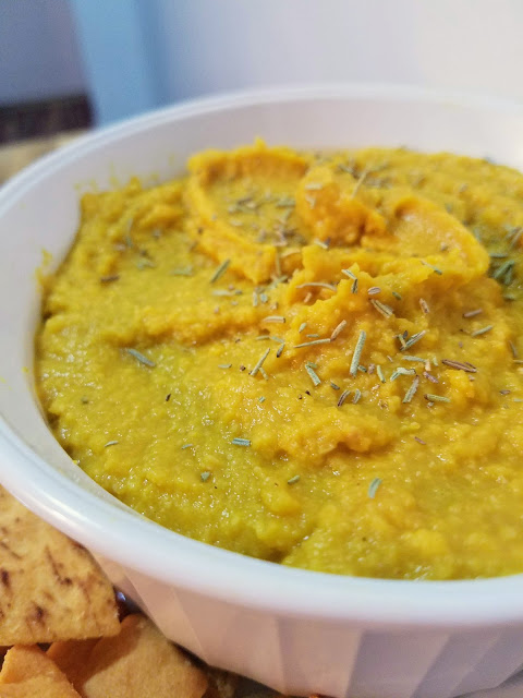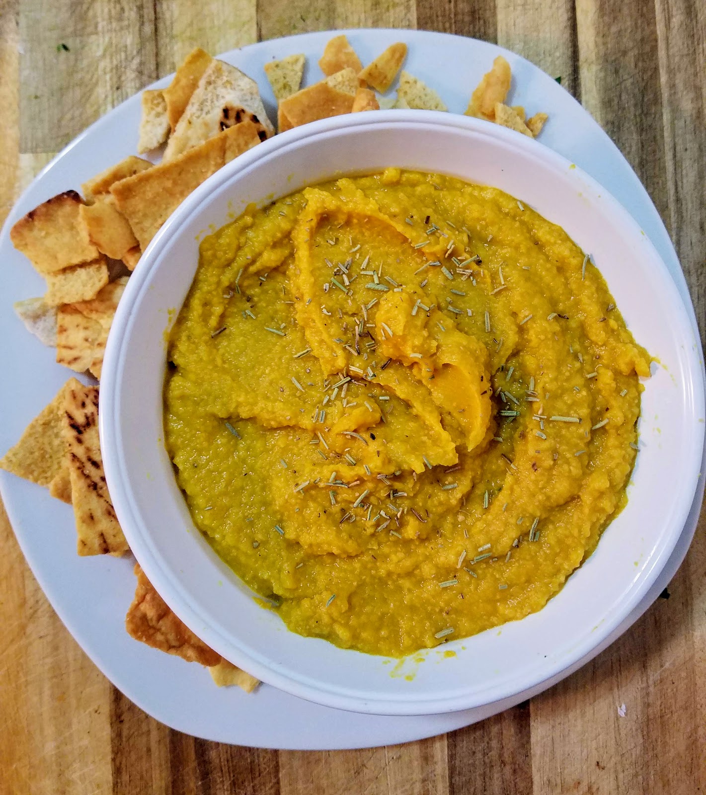 Add pumpkin, chickpeas, garlic, olive oil, lemon juice, cayenne, salt and pepper to a food processor and process until smooth. Serve topped with dried rosemary and paired with pita chips if desired.