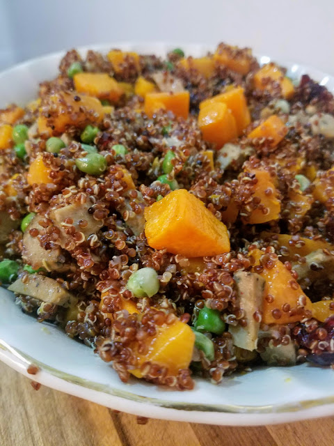 I love using red quinoa in this dish because of the deep red color in contrast to the bright orange squash, but you could use any quinoa you have on hand. The maple Dijon vinaigrette is the perfect tanginess and sweetness to balance out the sweet squash and the tart cranberries.